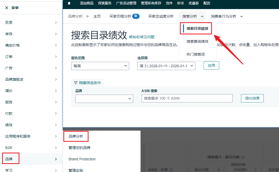 亚马逊后台数据源:卖家后台-品牌-品牌分析-搜索分析-搜索目录绩效(Search Catalog Performance)
