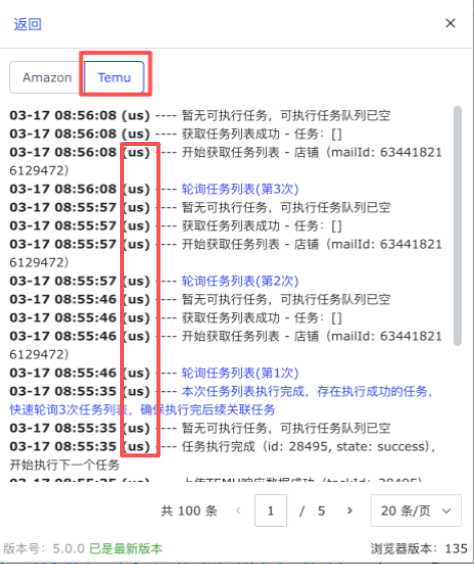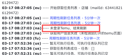 如上图,点击插件,查看操作日志,选择【TEMU】,日志中的US表示美国