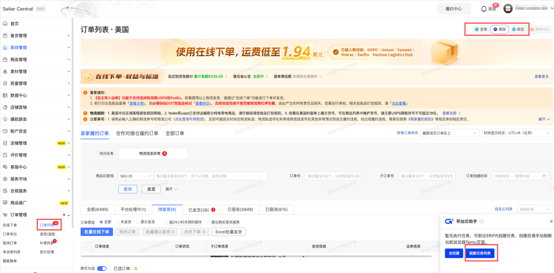 注意:浏览器插件只能抓取当前网页登录站点的订单是价格,所以如果有多个站点,需要切换,如上图,右上角,可以切换全球、美国、欧区