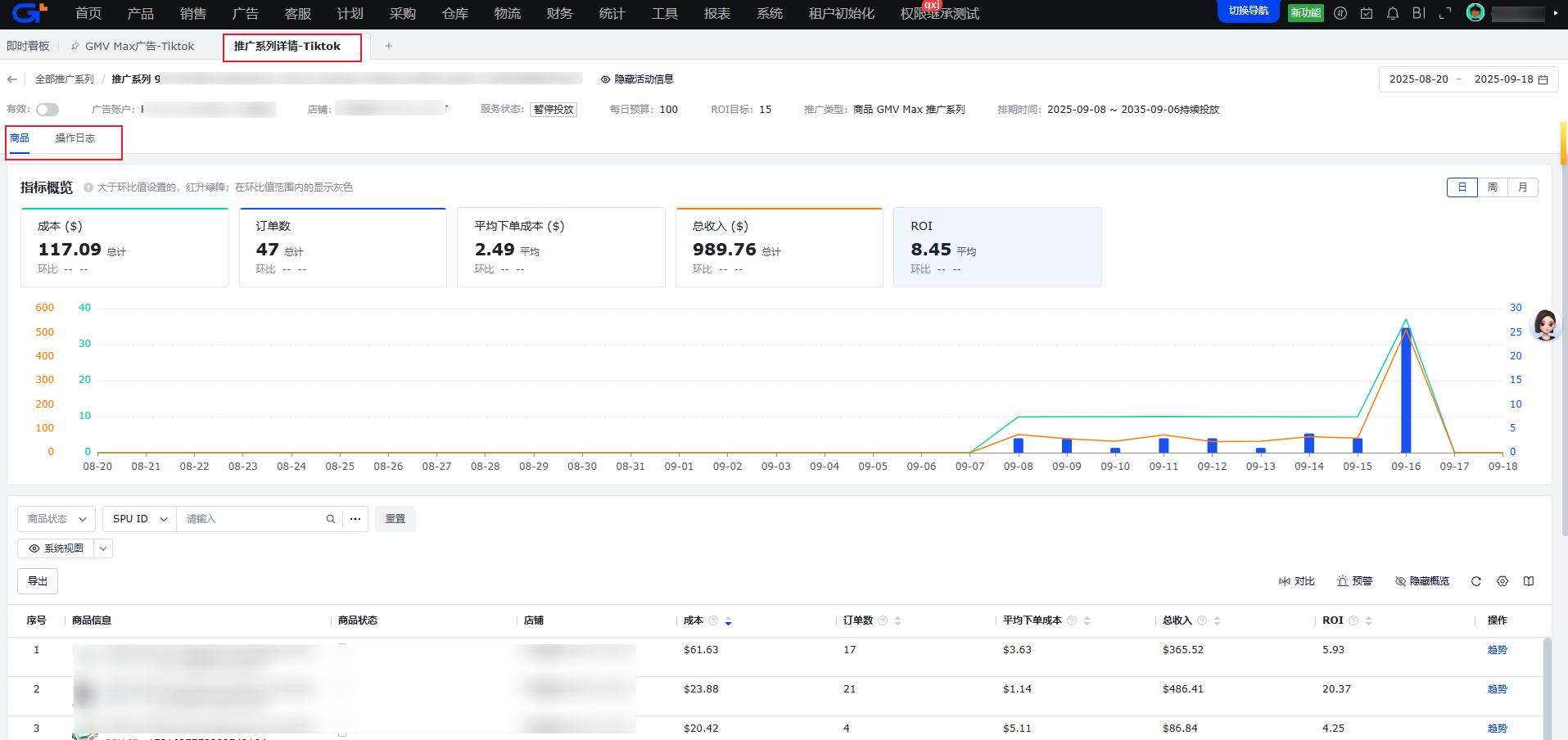 在列表数据中,点击推广系列名称,即可跳转到推广系列详情页面,详情页面展示商品Tab、操作日志Tab