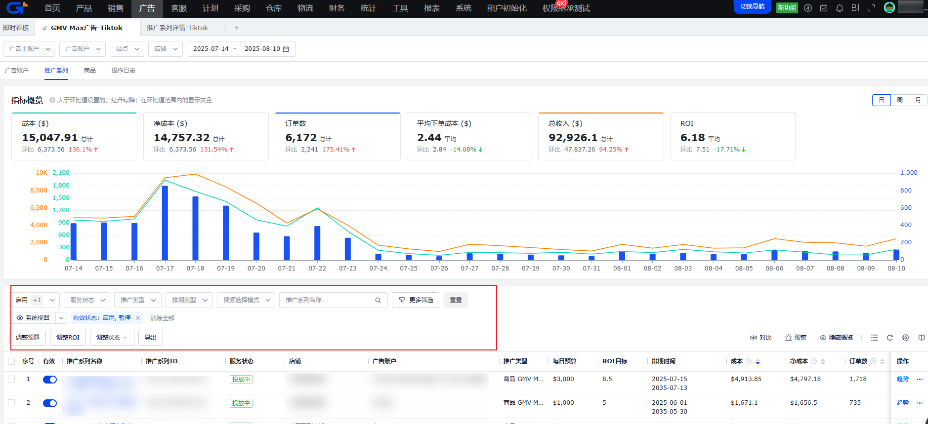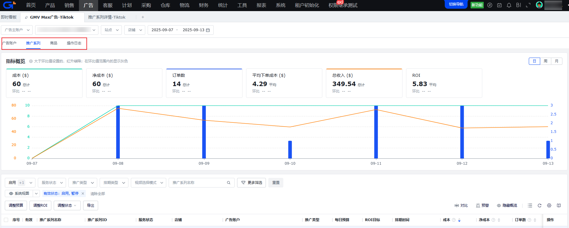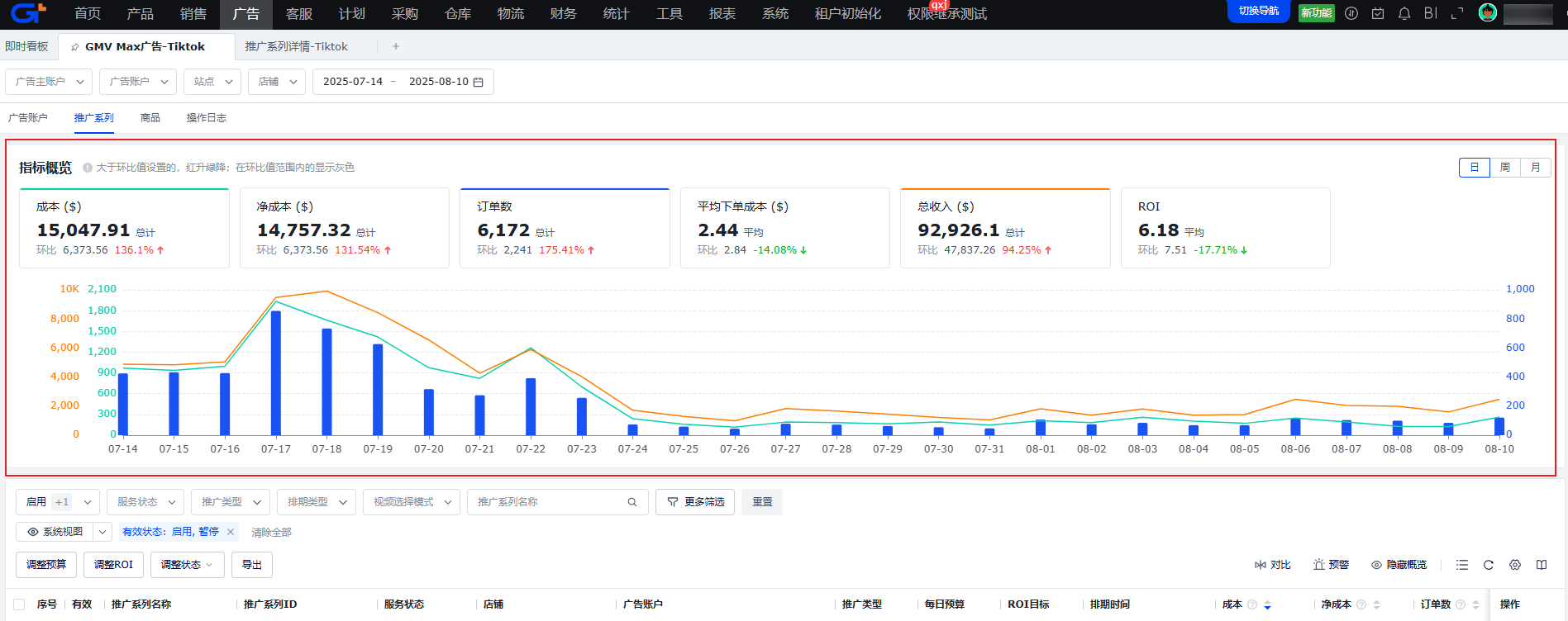 - 支持相关操作:针对推广系列调整预算、调整ROI目标值、调整状态