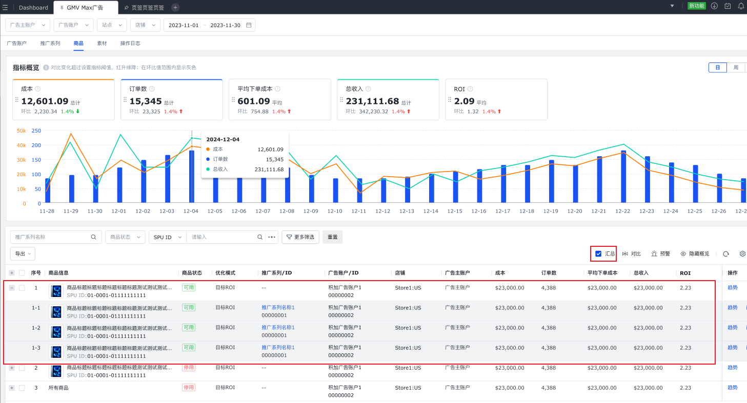 - 商品Tab:展示推广系列下商品层级的业绩指标数据,支持数据导出与趋势分析;