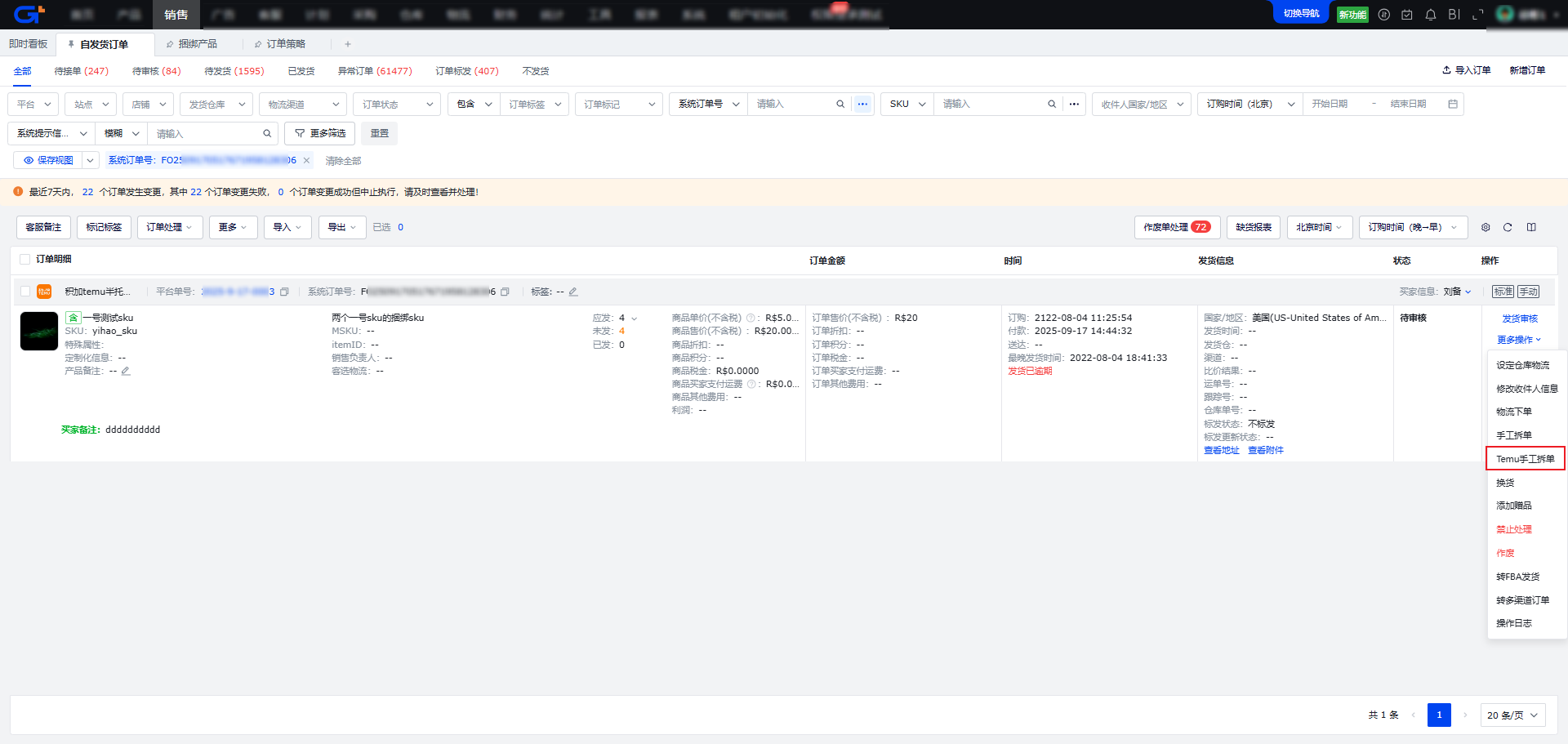 在自发货订单列表,点击列表后方操作栏中的【Temu手工拆单】按钮,弹出Temu手工拆单页面,页面布局说明: