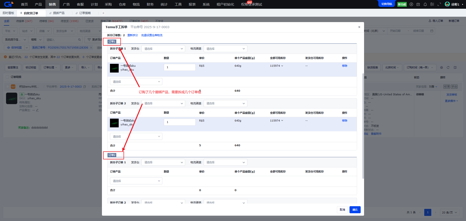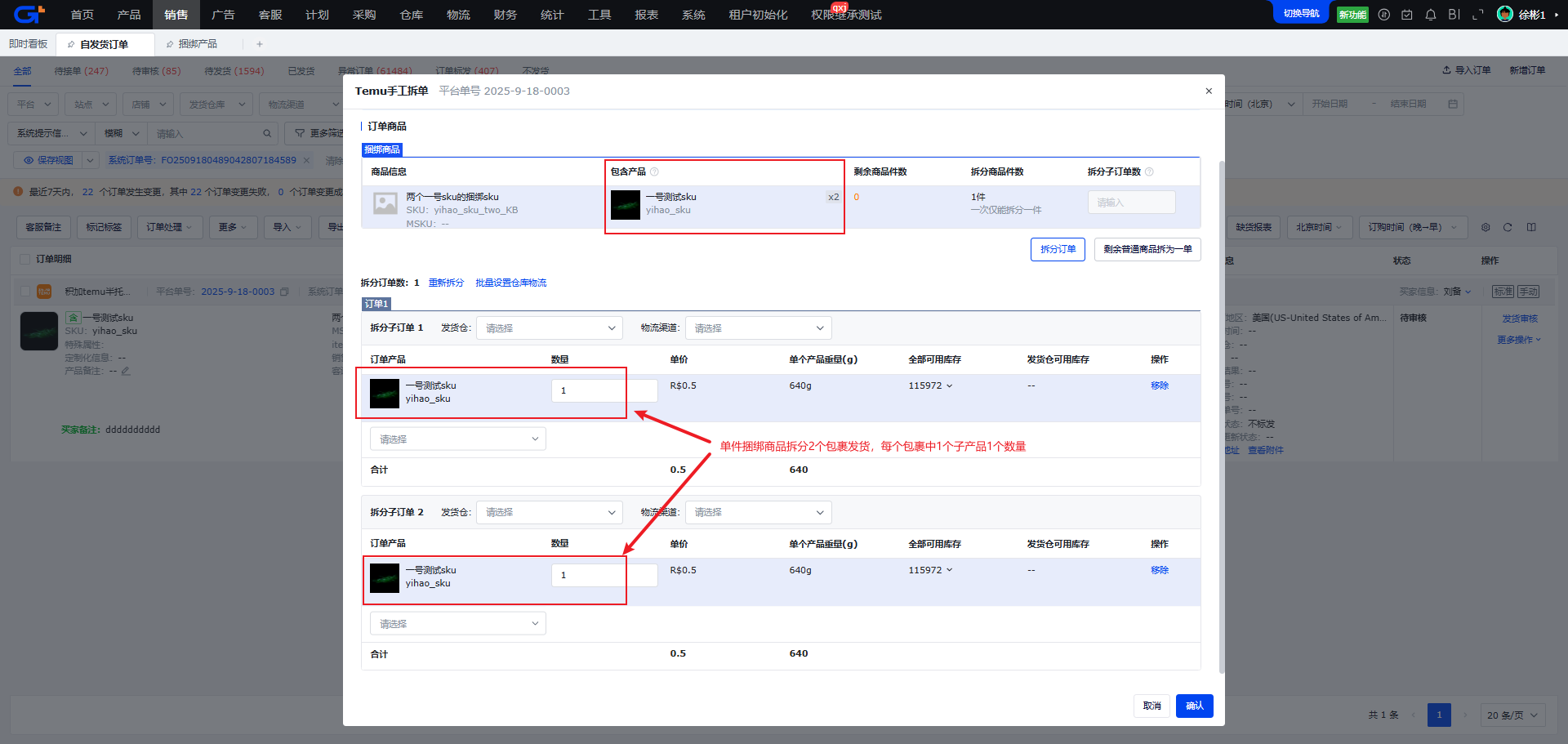 - 拆分商品件数:当前拆分的商品件数,对于捆绑产品,数量恒为1,一次仅能拆分1件,不可编辑