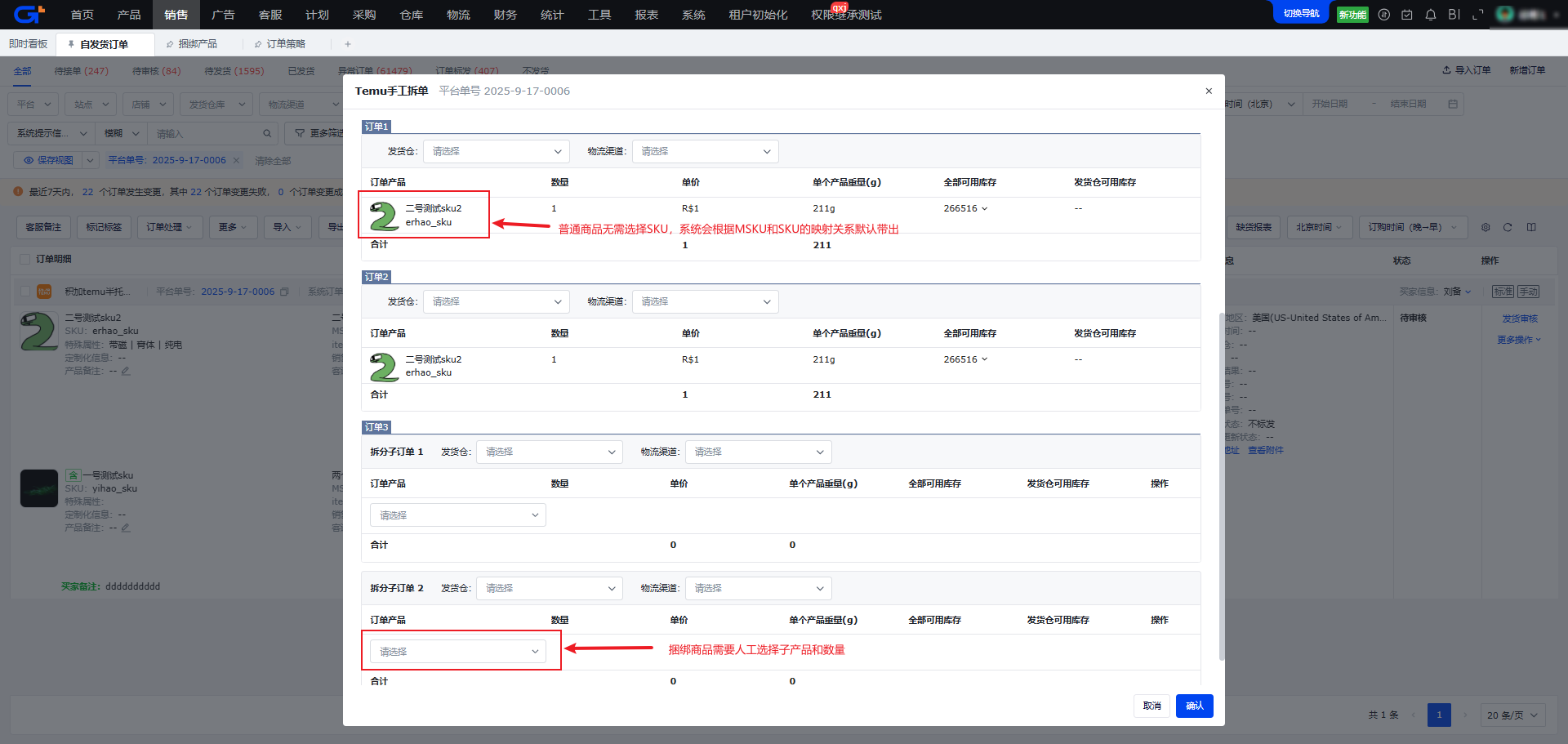 不同类型的订单拆单说明如下: