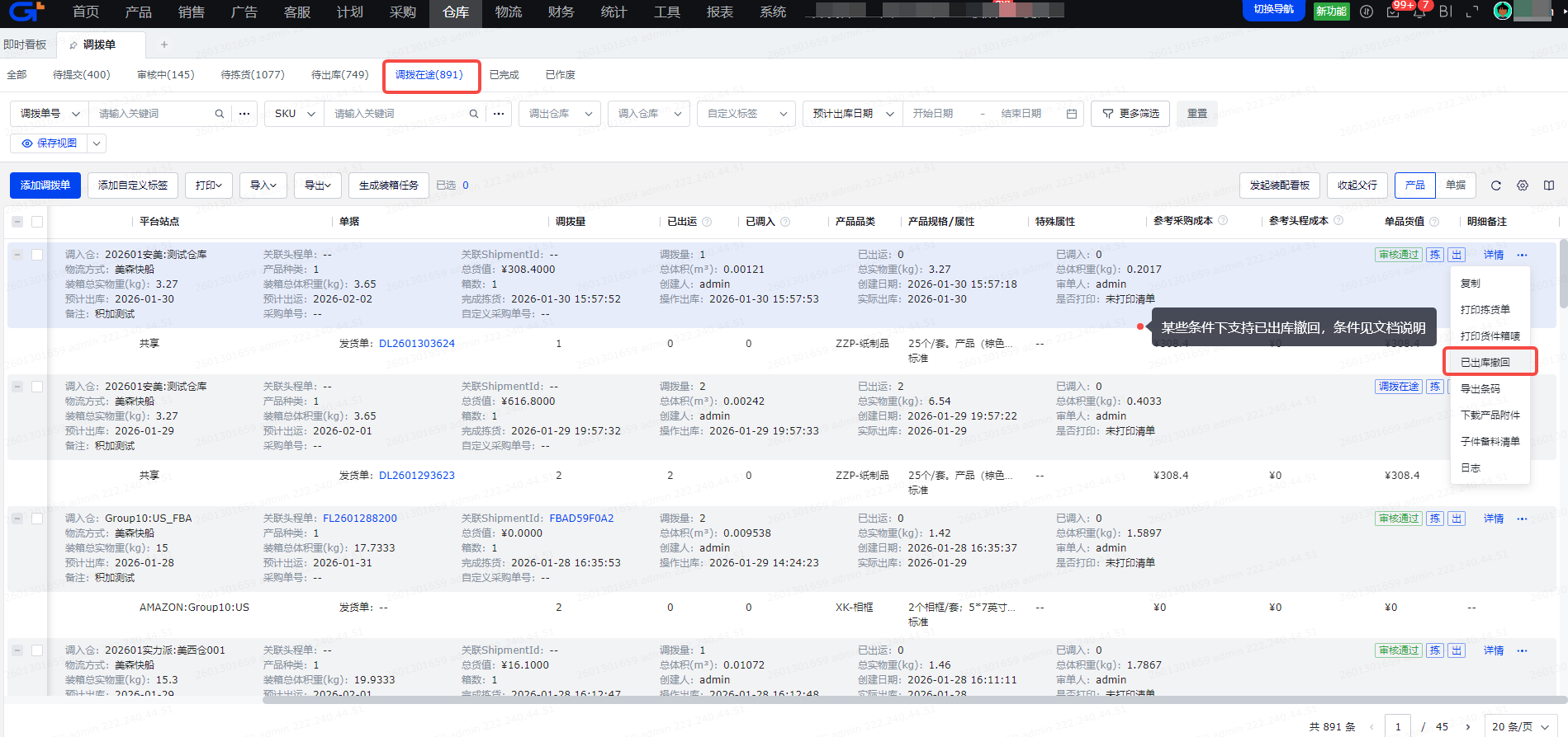 如果调拨单已绑定发货单,且发货单已全部出运,则不可再操作“已出库撤回”,需到【发货单】操作“已发作废”;