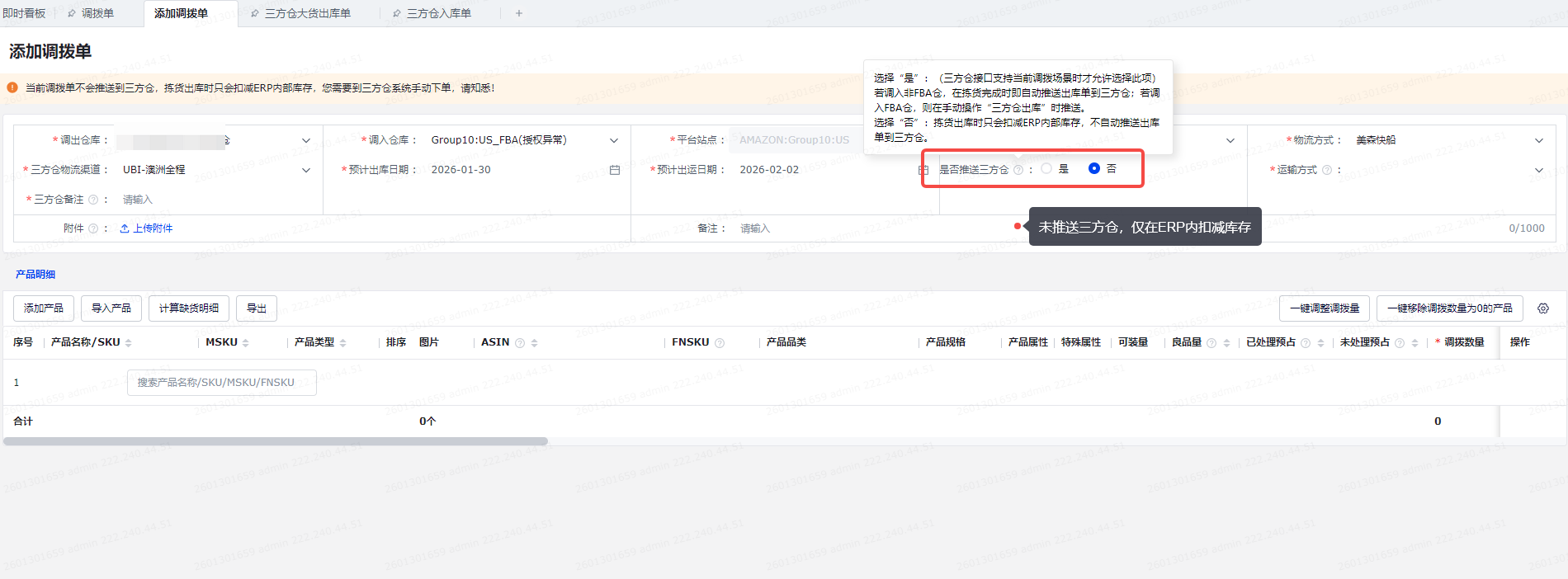 仅支持未推送三方仓的调拨单。