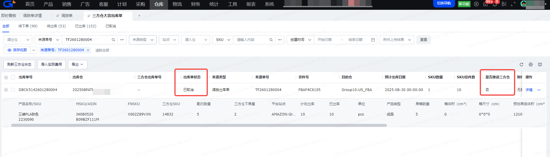 若调出仓为三方仓、调入仓为FBA仓,由于需要三方仓系统先操作出库,因此不会出现【出库】按钮。需先确认调拨单已绑定货件,然后点击【同步到三方仓】,系统会自动生成【三方仓调拨出库单】并同步下发到三方仓系统;待三方仓系统已完成出库、并被系统获取最新状态后,会自动将对应调拨单更新为“已出库”状态。