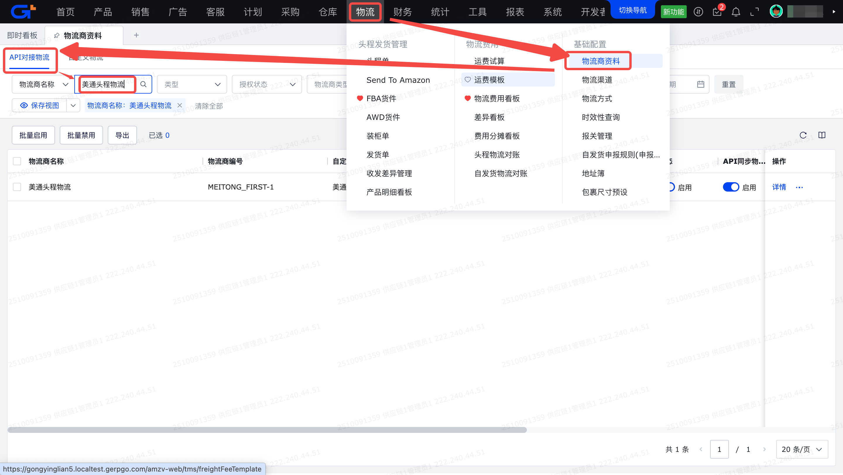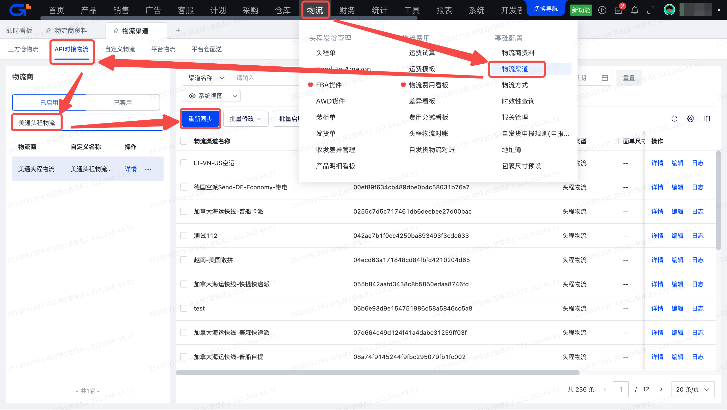 1. 配置入口:物流-基础配置-物流渠道/API对接物流