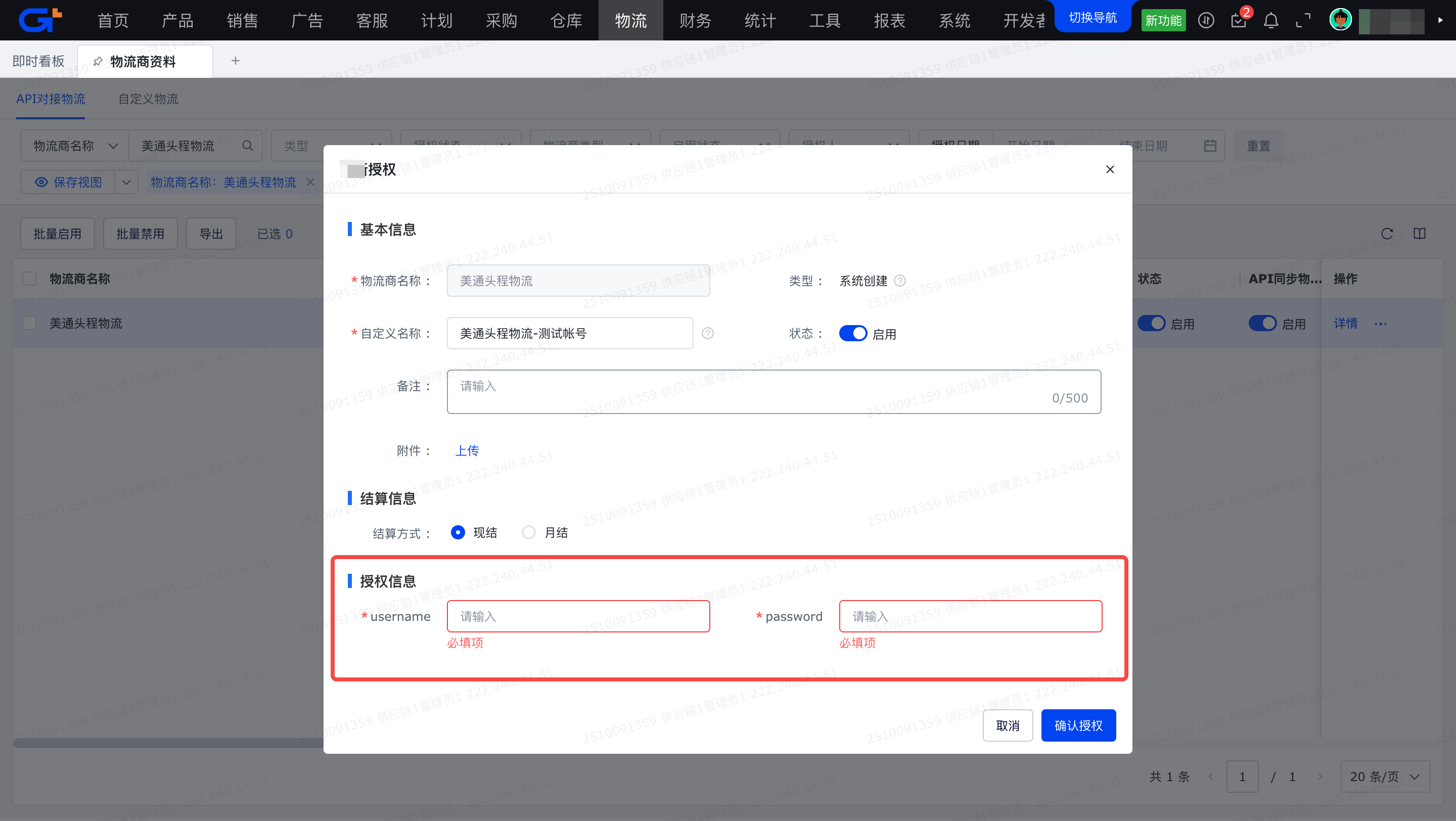 1. 授权入口:物流-基础配置-物流商资料/API对接物流