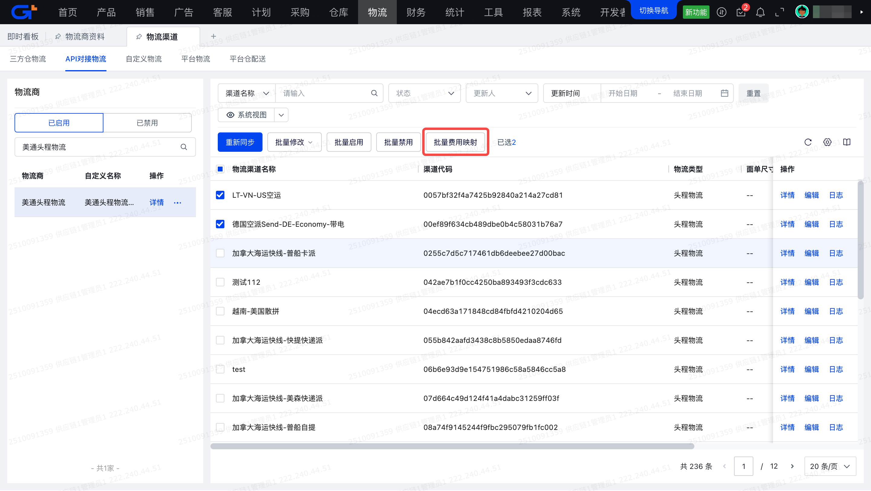勾选启用的物流渠道,点击【批量费用映射】按钮进行设置