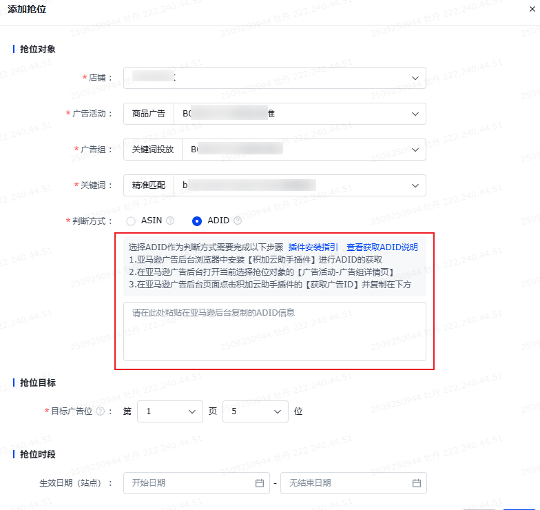 回到ERP系统添加关键词广告抢位任务页面,粘贴上面复制的ADID信息