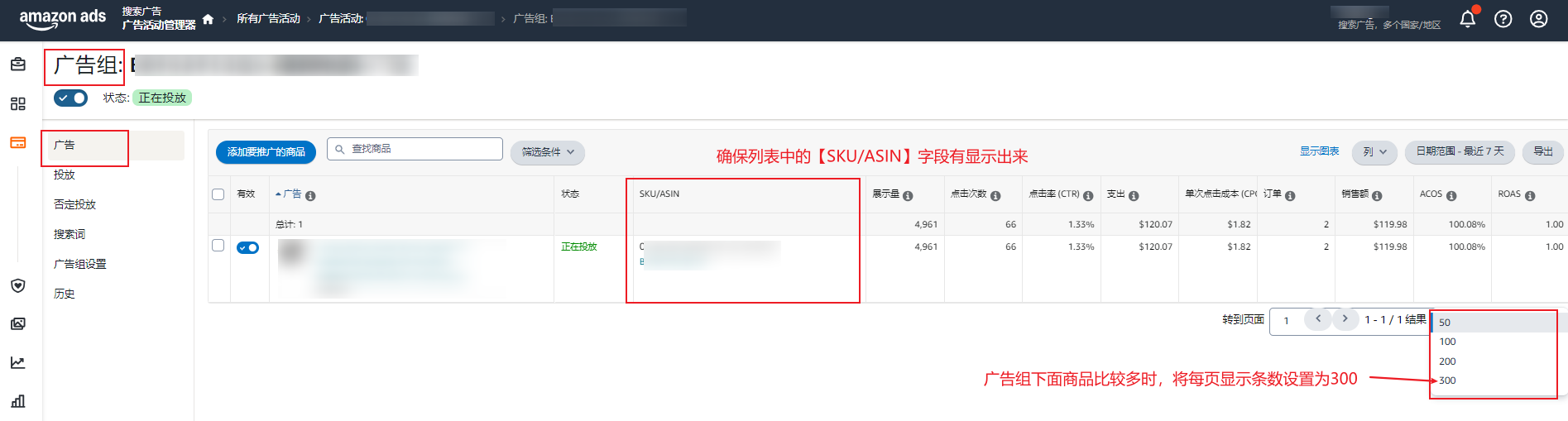 选择当前在积加ERP系统添加关键词广告抢位任务所选的广告活动和广告组,进入到广告组详情页面,并定位在【广告】列表;如果广告组下面商品比较多,请将列表设置为每页显示300条记录