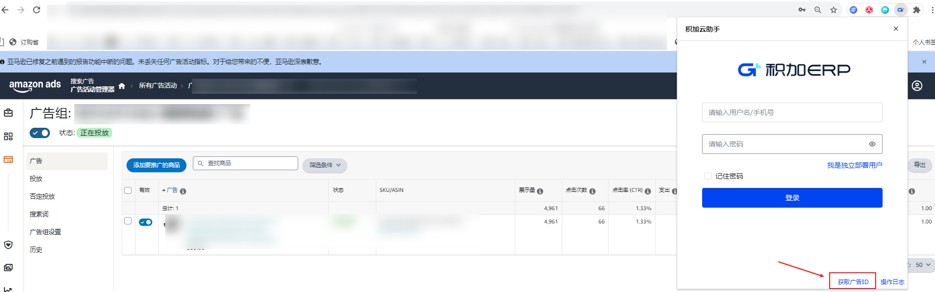在上面进入的亚马逊广告后台的浏览器中打开积加插件;无需登录,直接在插件页面点击【提取ADID】按钮即可
