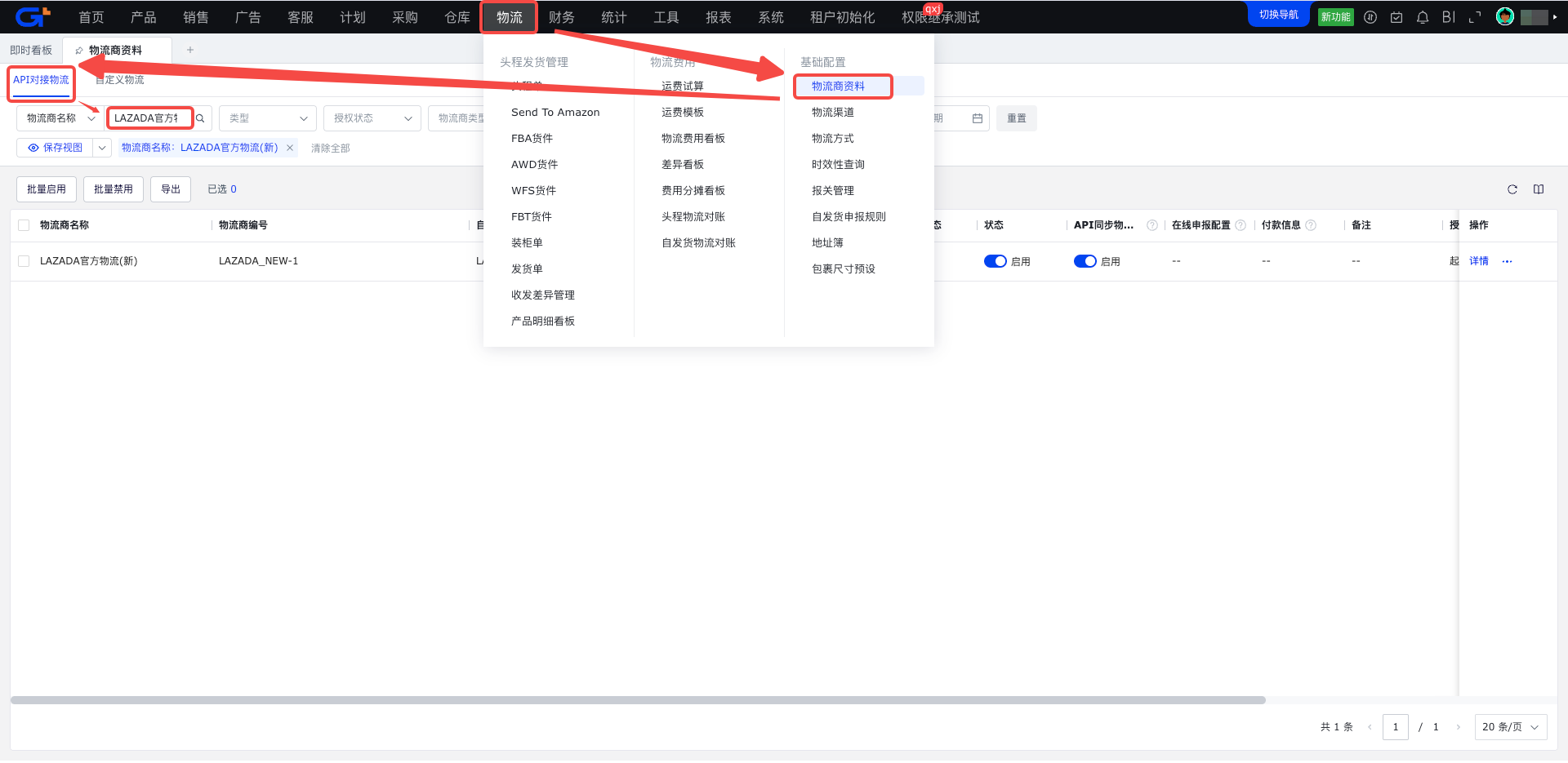 1. 配置入口:物流-基础配置-物流渠道/API对接物流