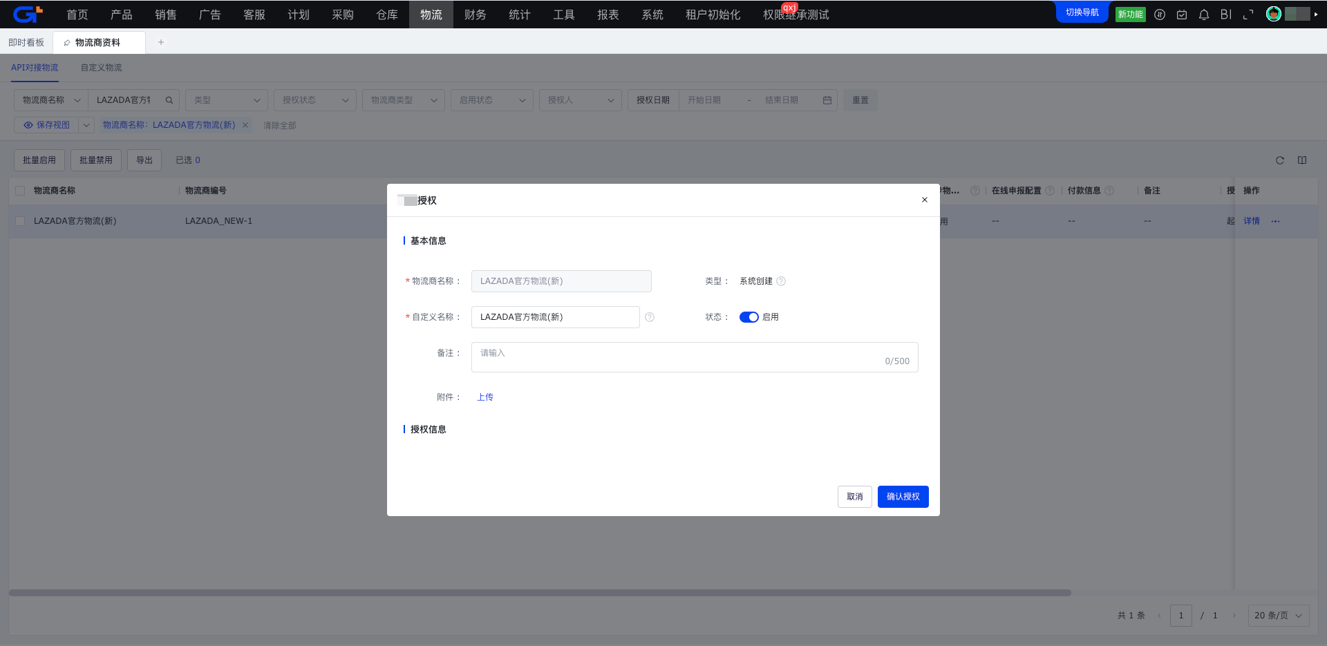 1. 授权入口:物流-基础配置-物流商资料/API对接物流