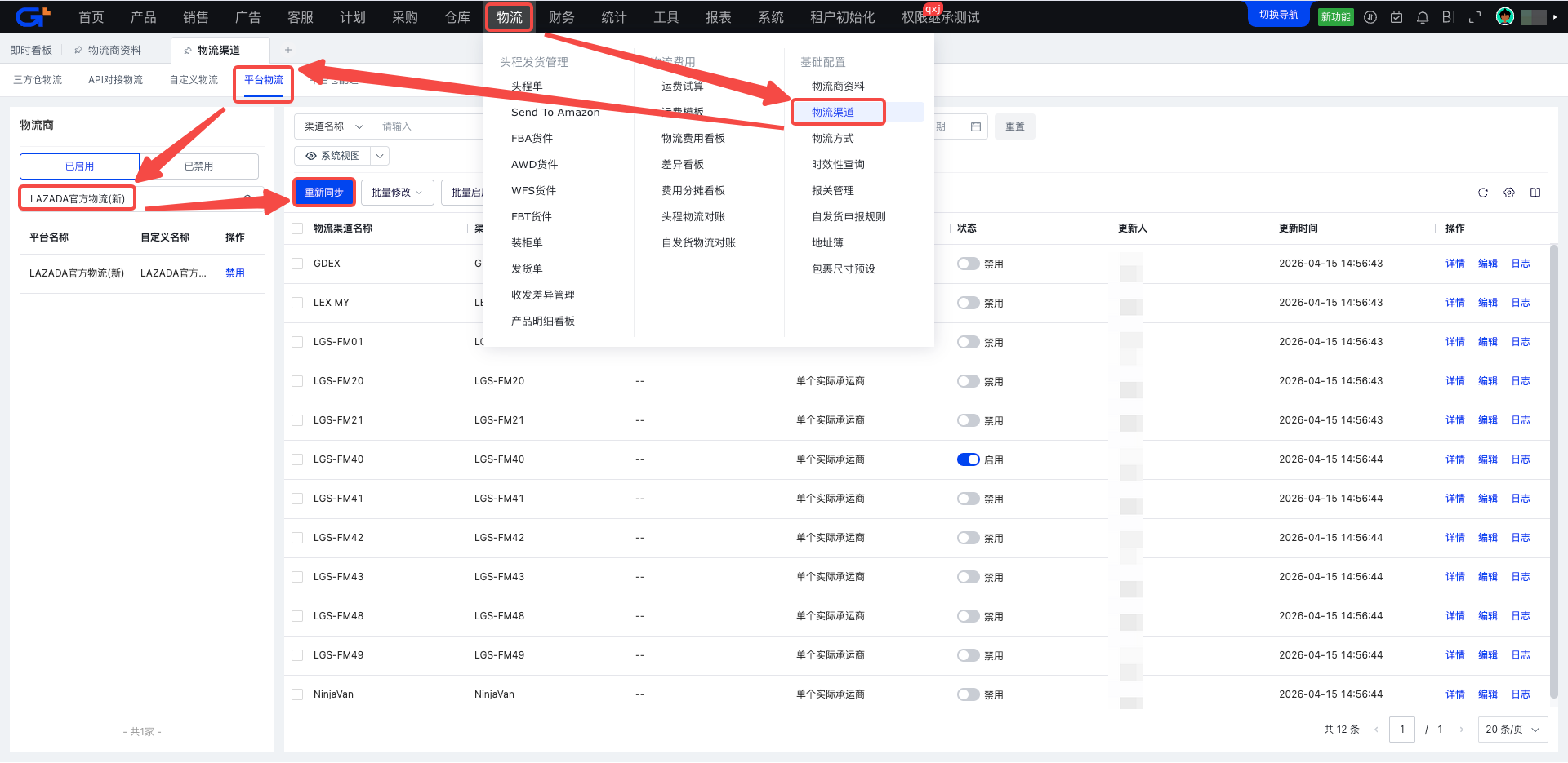 点击【重新同步】,从显示的物流渠道中找到需要使用的物流渠道并进行“启用”