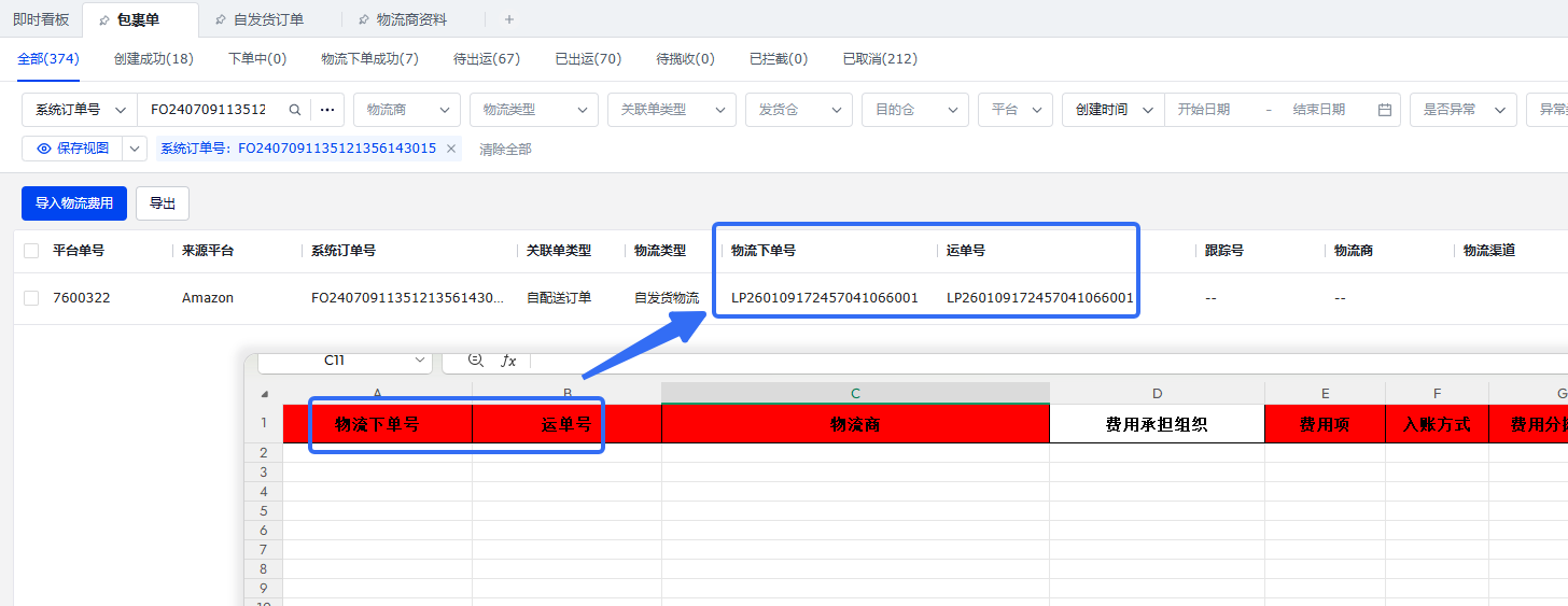 如果需要导入物流费用,按照生成的包裹单来填写物流下单后和运单号即可