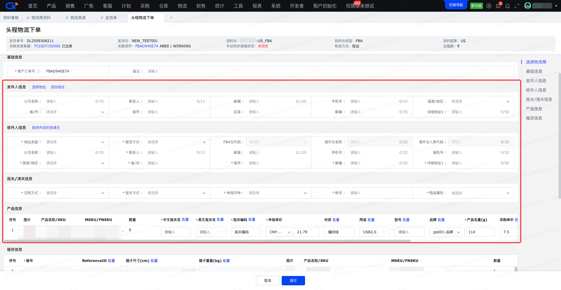1. 需要先选择头程物流商,根据选择的物流商显示不同的填写内容