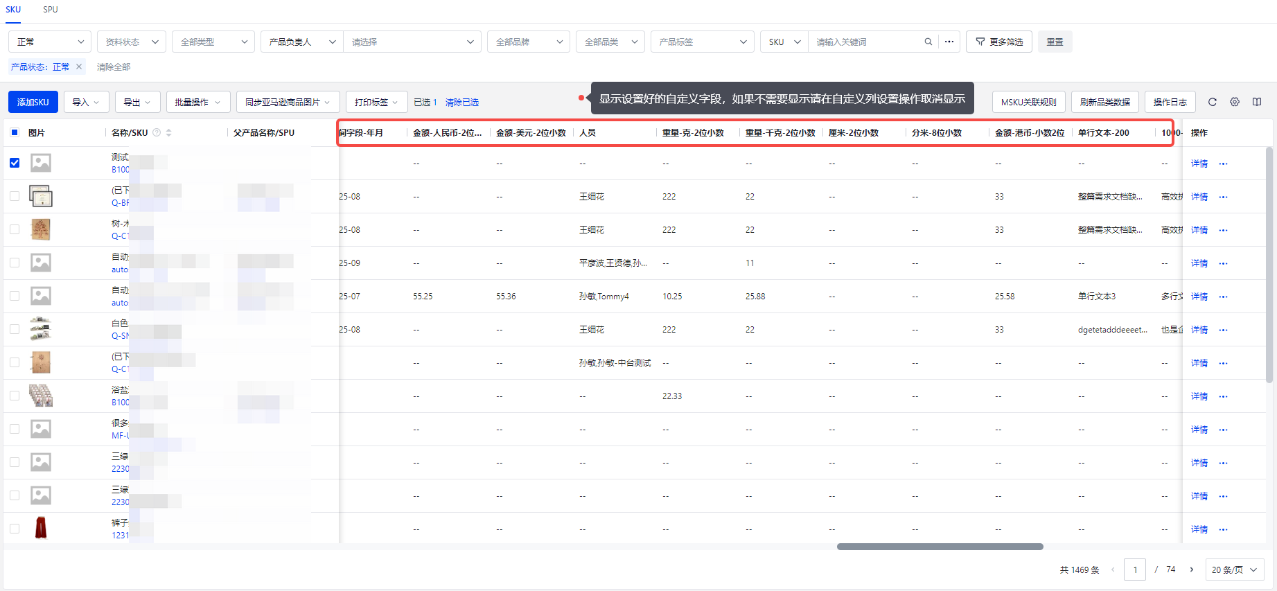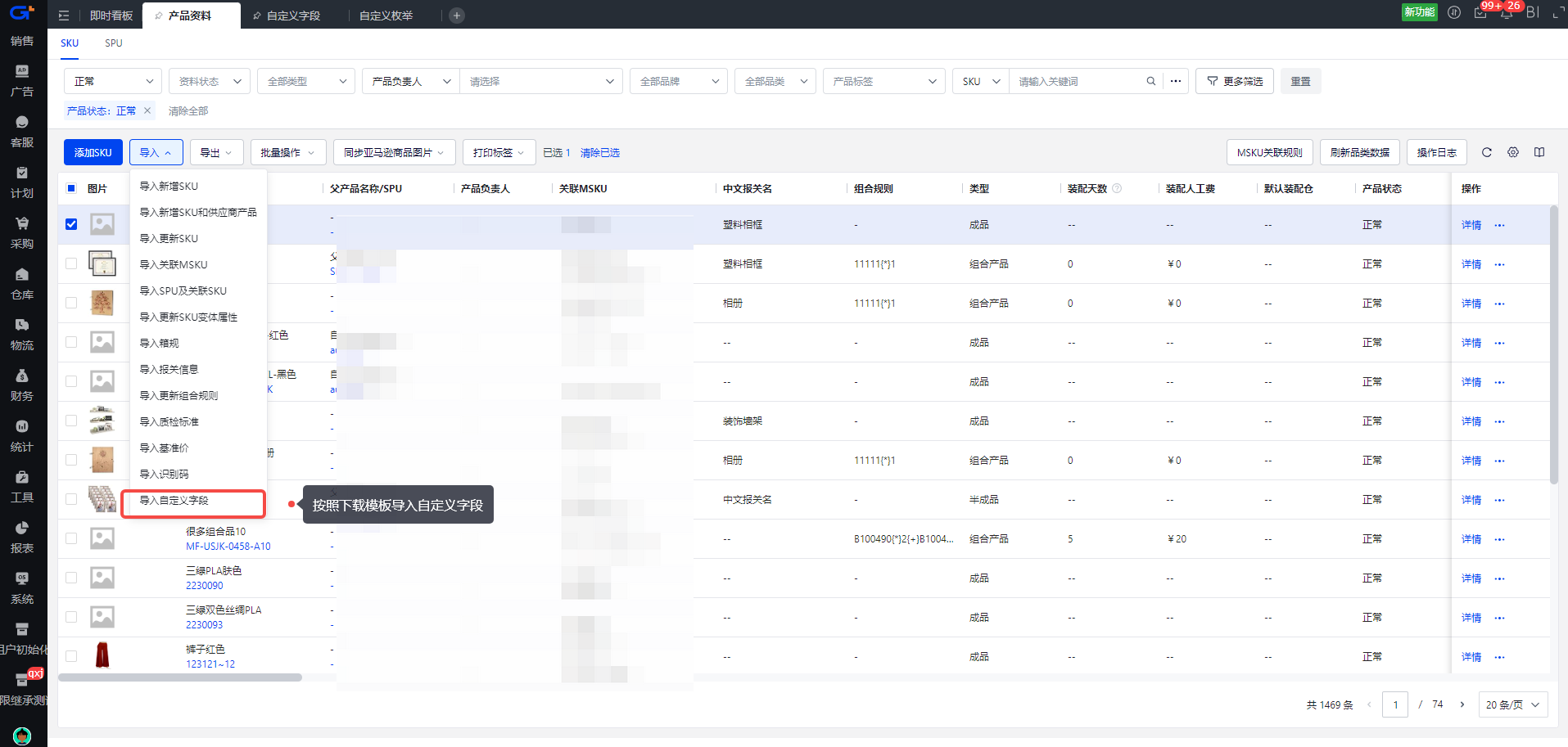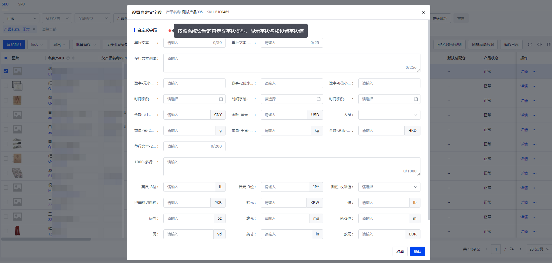 在【产品-产品资料】设置自定义字段,自定义字段来源于模块【系统-自定义字段】设置。