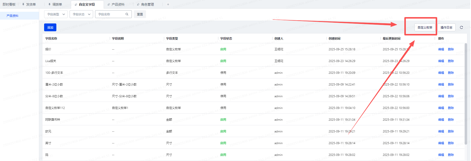 维护好的自定义枚举,可以在自定义字段新增的时候,选择【自定义枚举】-【值来源】的下拉选择中选到,相当于用户自己维护的枚举值可以多次重复使用