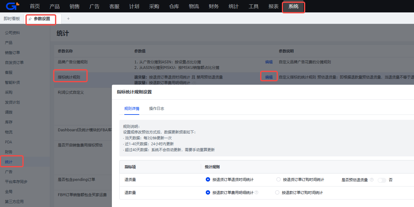 默认按退货订单退货时间统计、按退款订单费用明细统计,也可以改成按退货订单订购时间统计、按退款订单订购时间统计