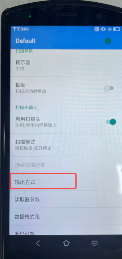 在【设置】中找到入口【ScanWedge配置文件】,进入页面点击“Dfault”选择:输出方式