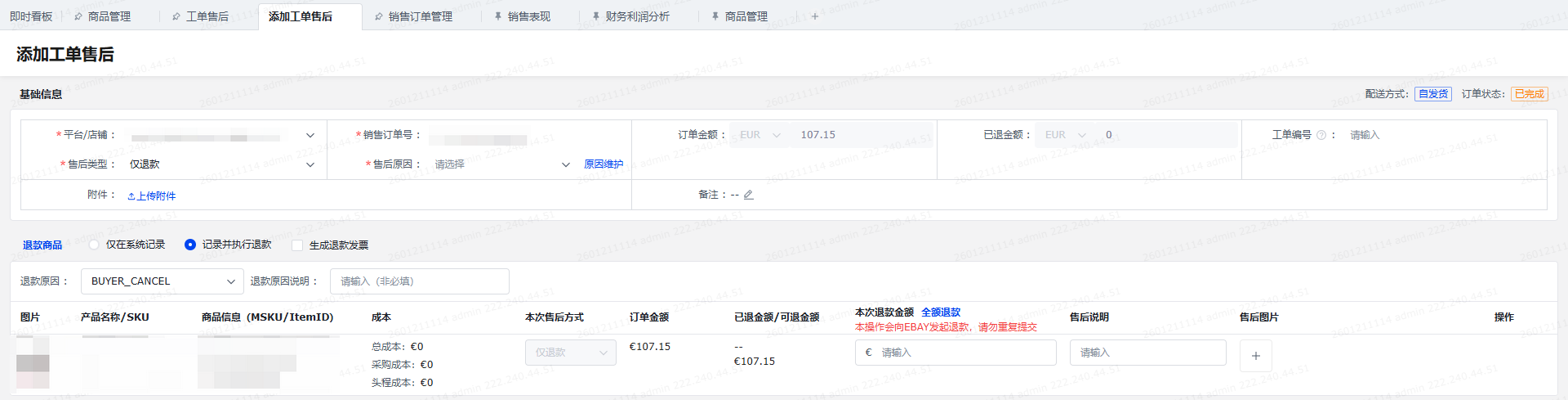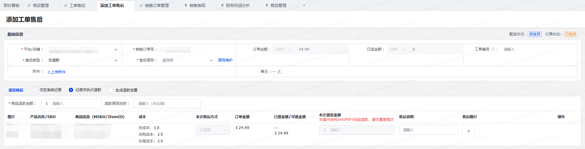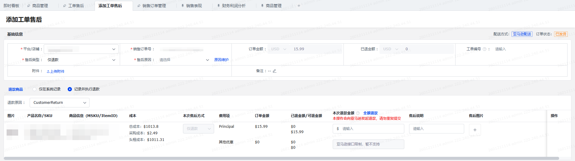 当前仅支持Amazon、ebay、shopify。需要在售后工单页面选择【记录并执行退款】。选择该功能后,填写的退款信息会同步请求平台进行退款(请勿与销售订单退款功能重复使用,避免多次退款)