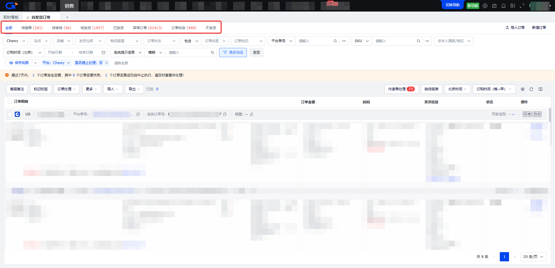 如果使用自定义物流,需要手动上传面单,然后根据发货仓类型将自发货订单推送到销售出库单(自营仓发货)或者三方仓销售出库单(三方仓发货),然后从销售出库单/三方仓销售出库单推送到仓库进行发货