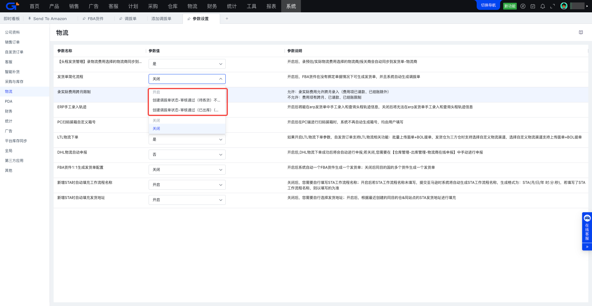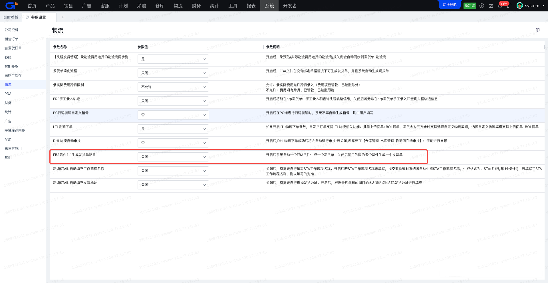 参数说明: 默认关闭,开启后系统自动一个FBA货件生成一个发货单;关闭后同目的国的多个货件生成一个发货单
