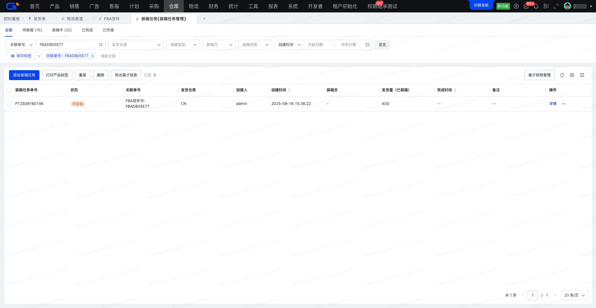 对指定货件生成装箱任务,生成装箱任务成功后可在【仓库/库内管理/装箱任务】中查看并进行装箱