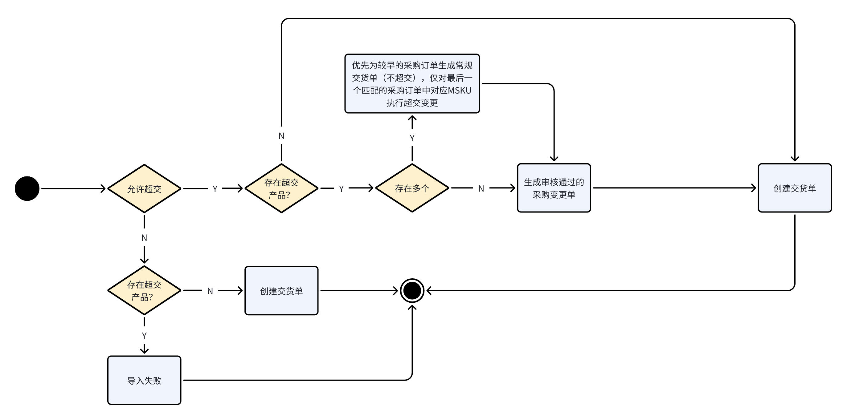 当出现超交的情况,基于供应商+SKU找到多个PO单时,系统仅对最后一个匹配的采购订单执行超交变更