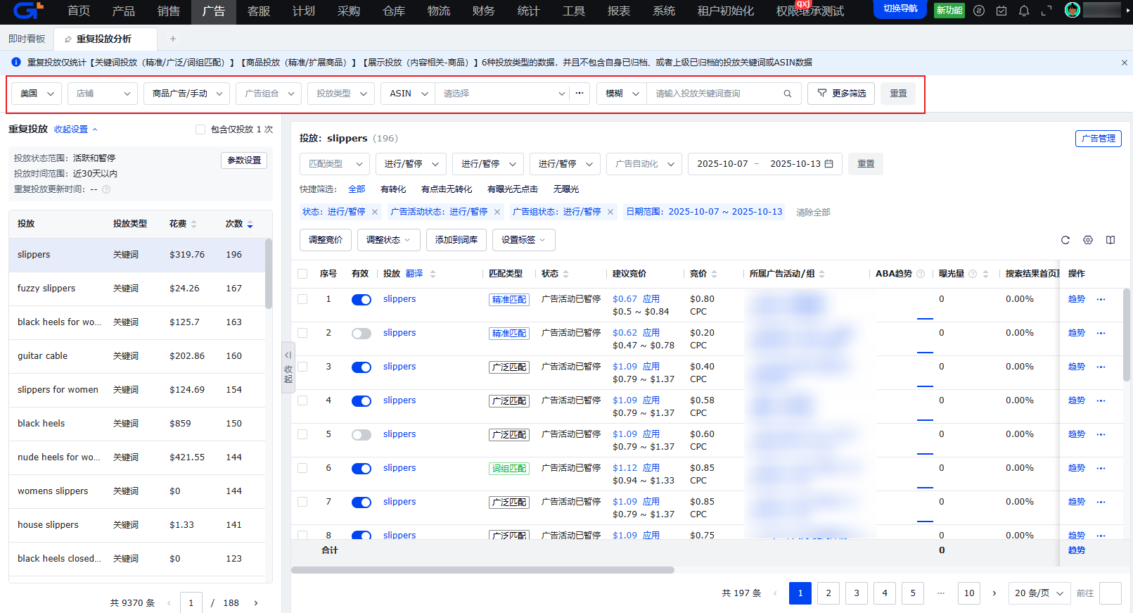顶部查询条件操作后,先对左侧边栏重复投放列表的数据生效,因为左侧边栏列表数据的刷新,右侧显示的关联广告数据也会同步刷新