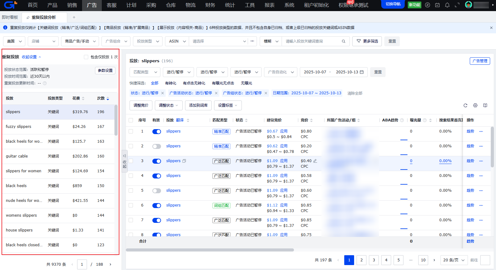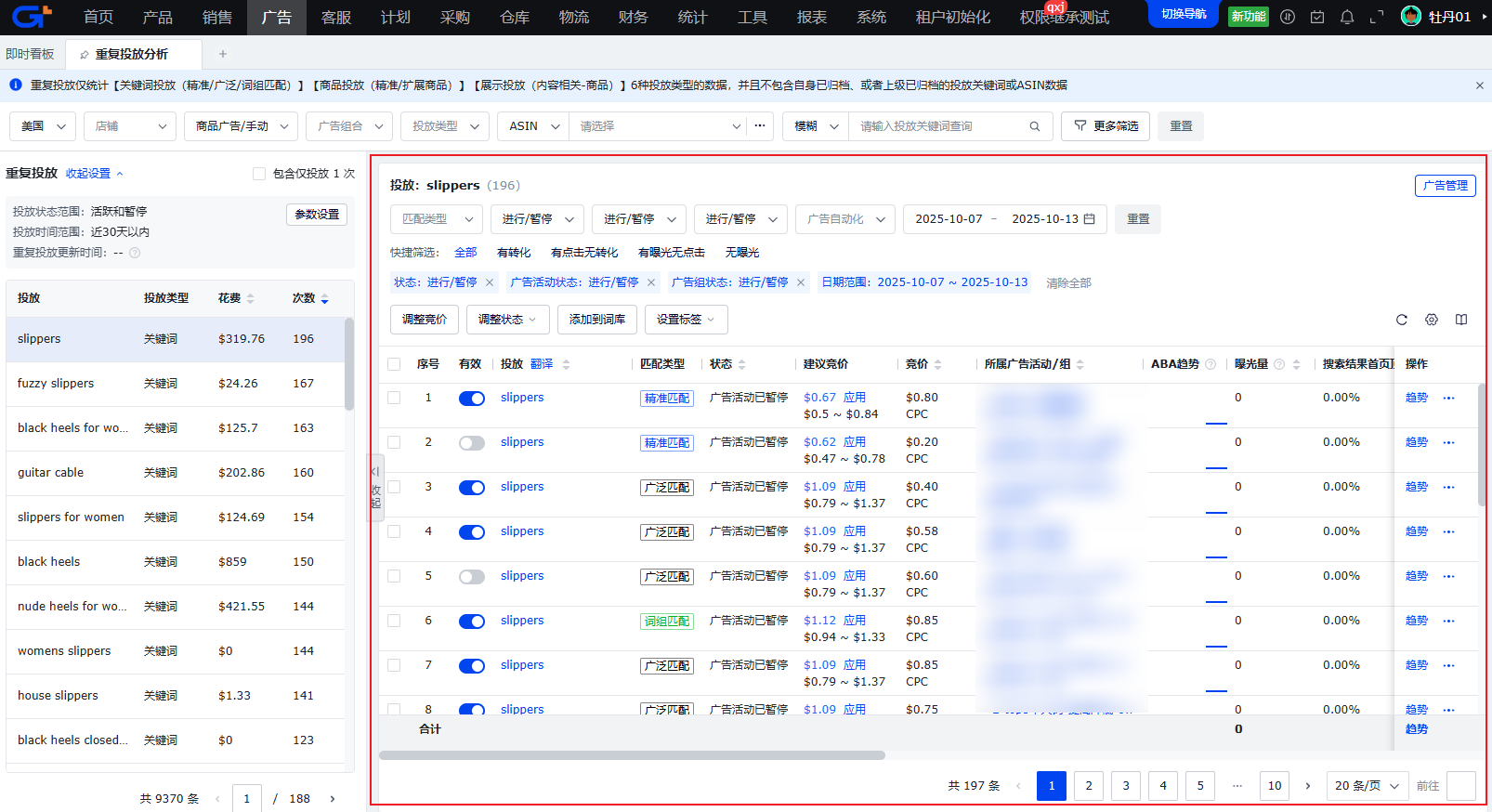 支持按站点汇总多个店铺的关键词投放、商品投放的的数据,统计重复投放次数、支持查看每个投放词或者ASIN关联的广告活动相关信息