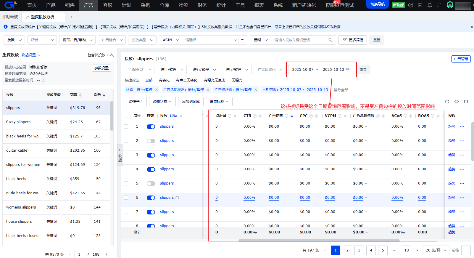 - 统计范围说明:重复投放仅统计【关键词投放(精准/广泛/词组匹配)】【商品投放(精准/扩展商品)】【展示投放(内容相关-商品)】6种投放类型的数据,并且不包含自身已归档、或者上级已归档的投放关键词或ASIN数据