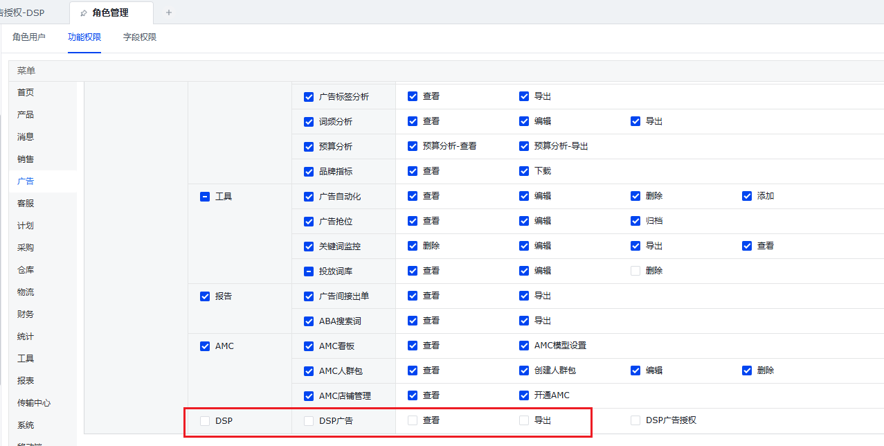 需要在系统查看DSP广告数据,用户需要拥有DSP广告模块的相关操作权限