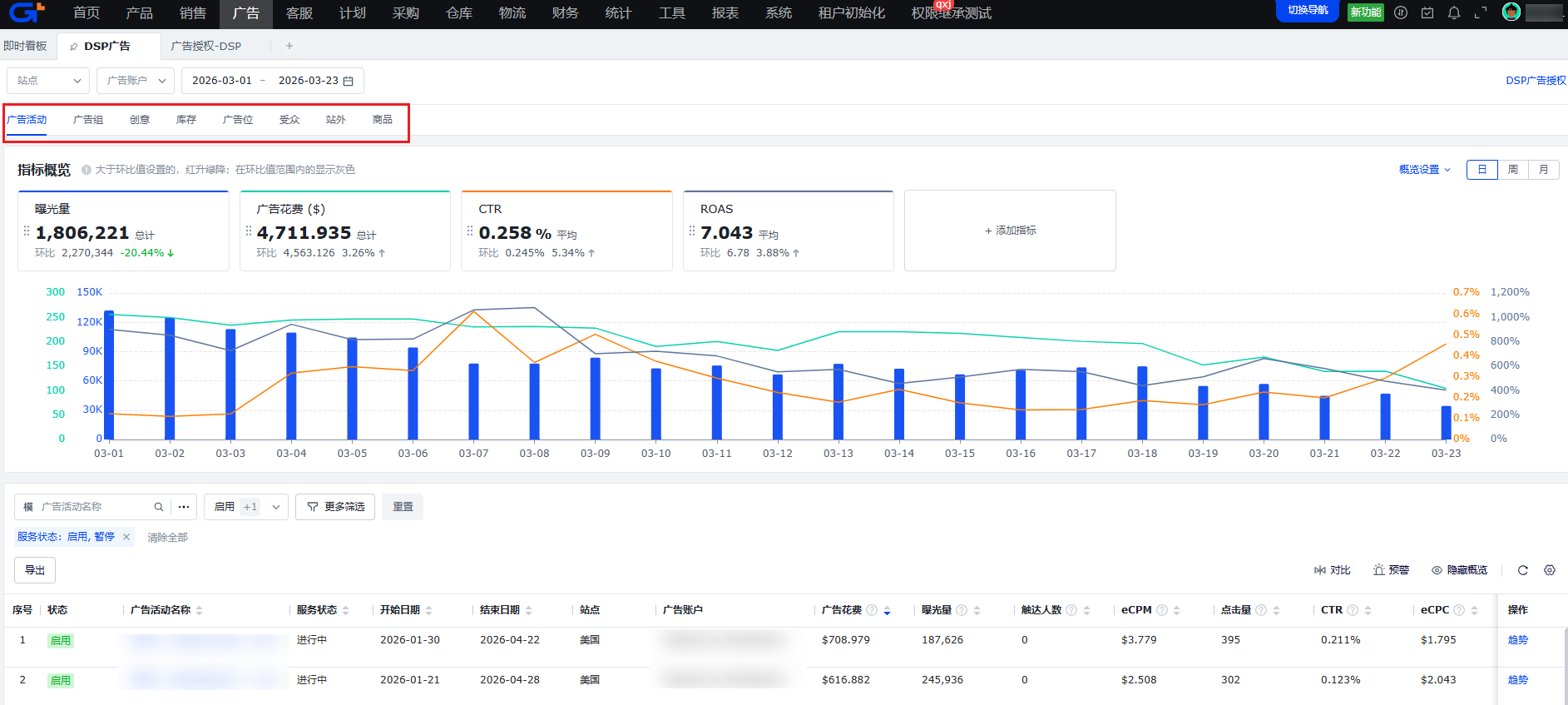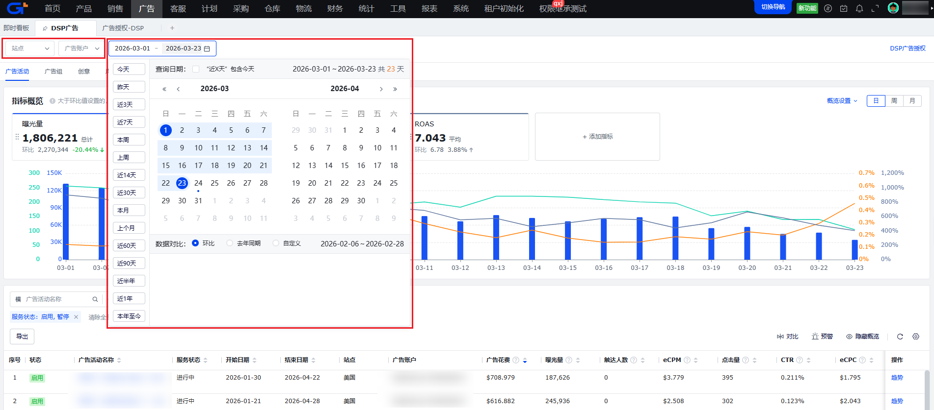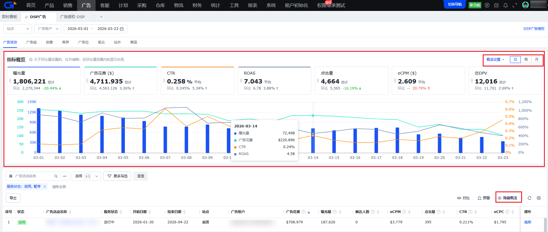 在完成DSP广告授权后,系统自动同步DSP广告报表,支持多个DSP广告结构层级的报表数据趋势分析、列表查询、数据导出