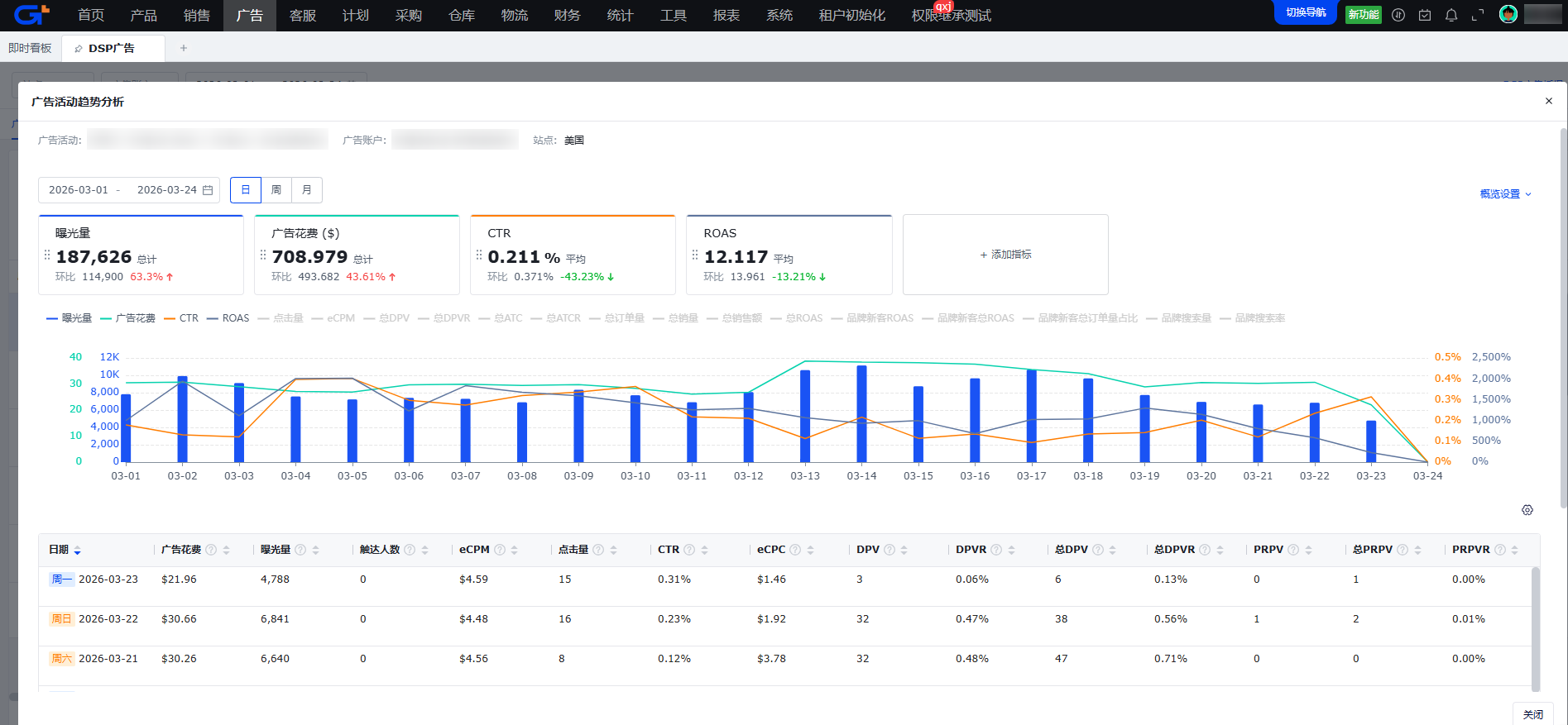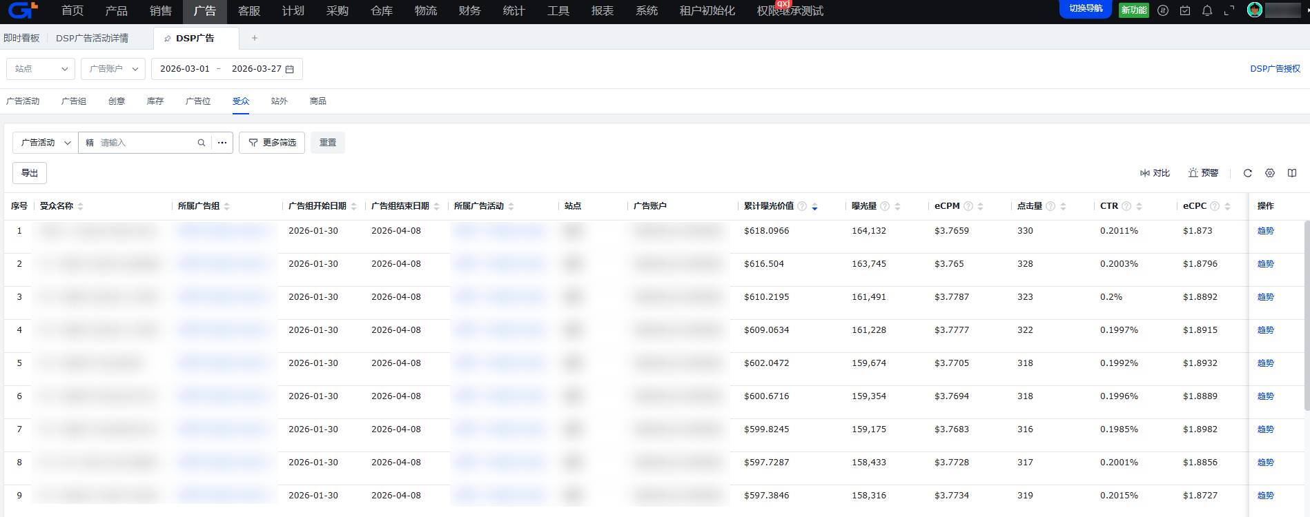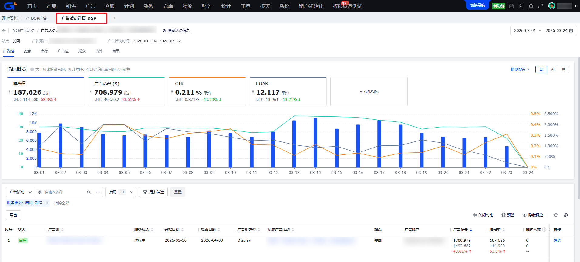 在完成DSP广告授权后,系统自动同步DSP广告报表,支持多个DSP广告结构层级的报表数据趋势分析、列表查询、数据导出