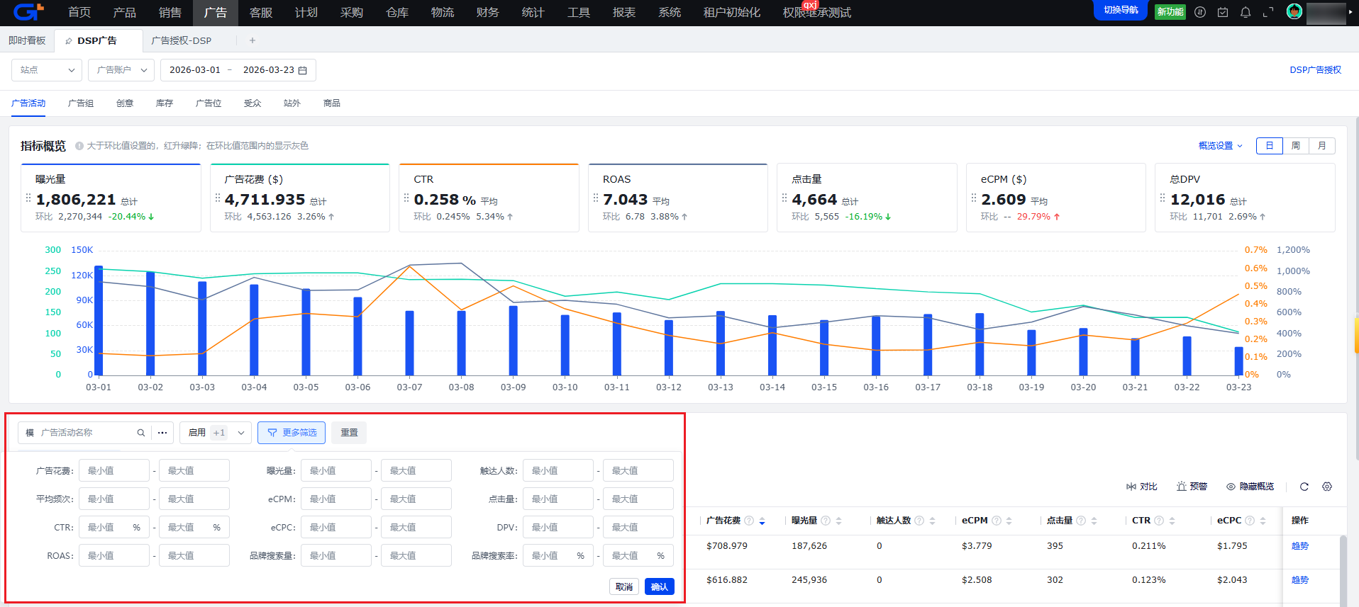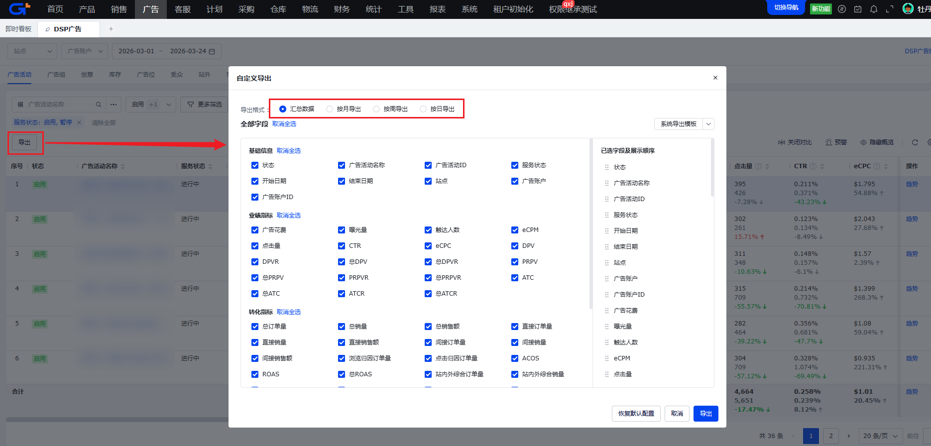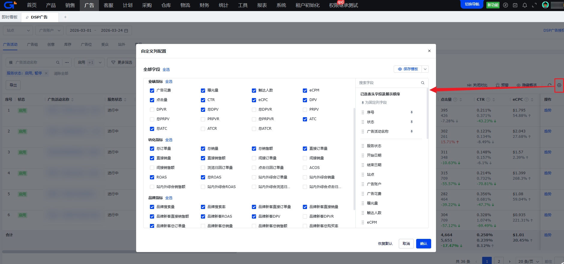 DSP广告报表业绩指标较多,目前ERP系统仅对接了其中部分指标,当前支持的指标可以在列表自定义设置中自由选择是否展示