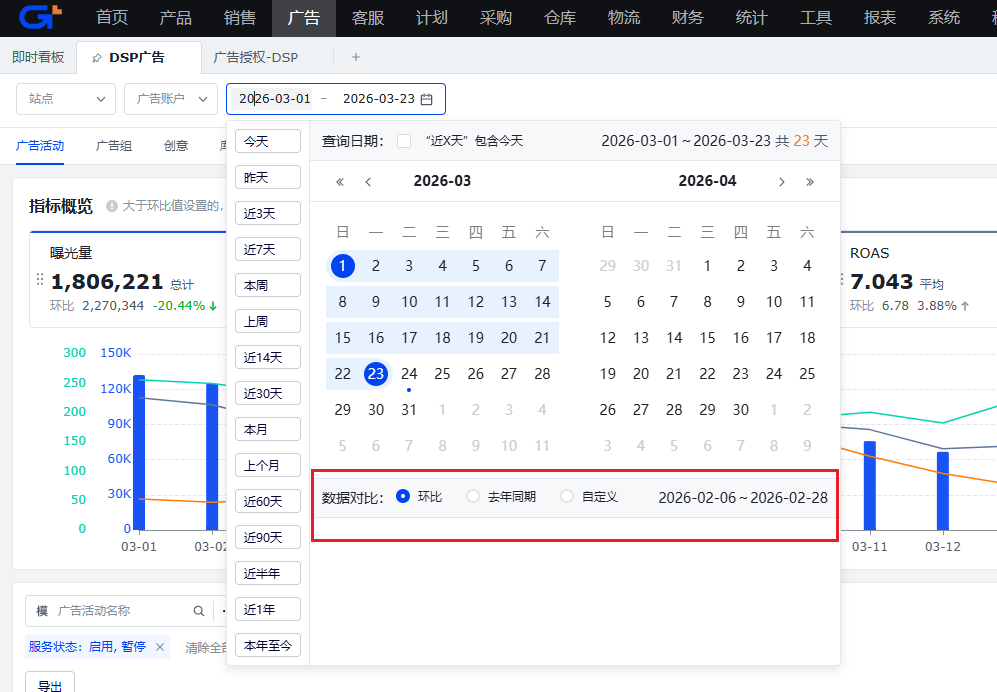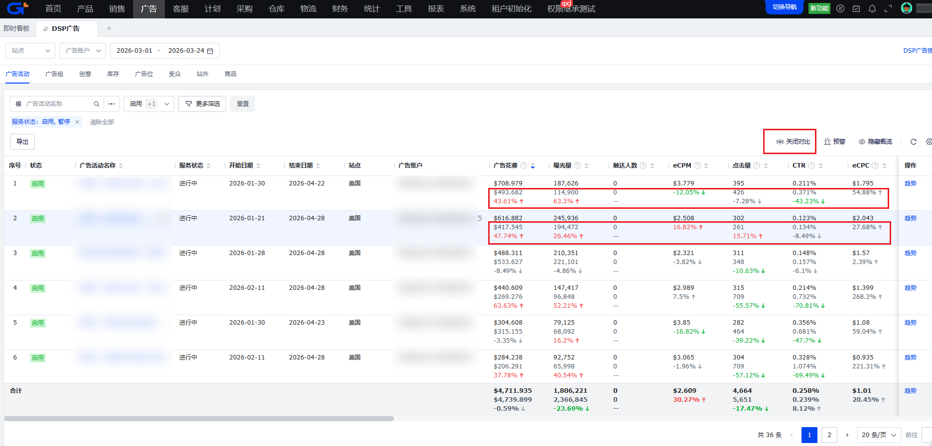对比/关闭对比:选择展示对比数据,即在数据列表中,展示当前查询日期范围对应环比、或者去年同期、或者自定义对比时间范围的数据(即一个广告业绩指标字段,展示两个时间范围的统计数据)
