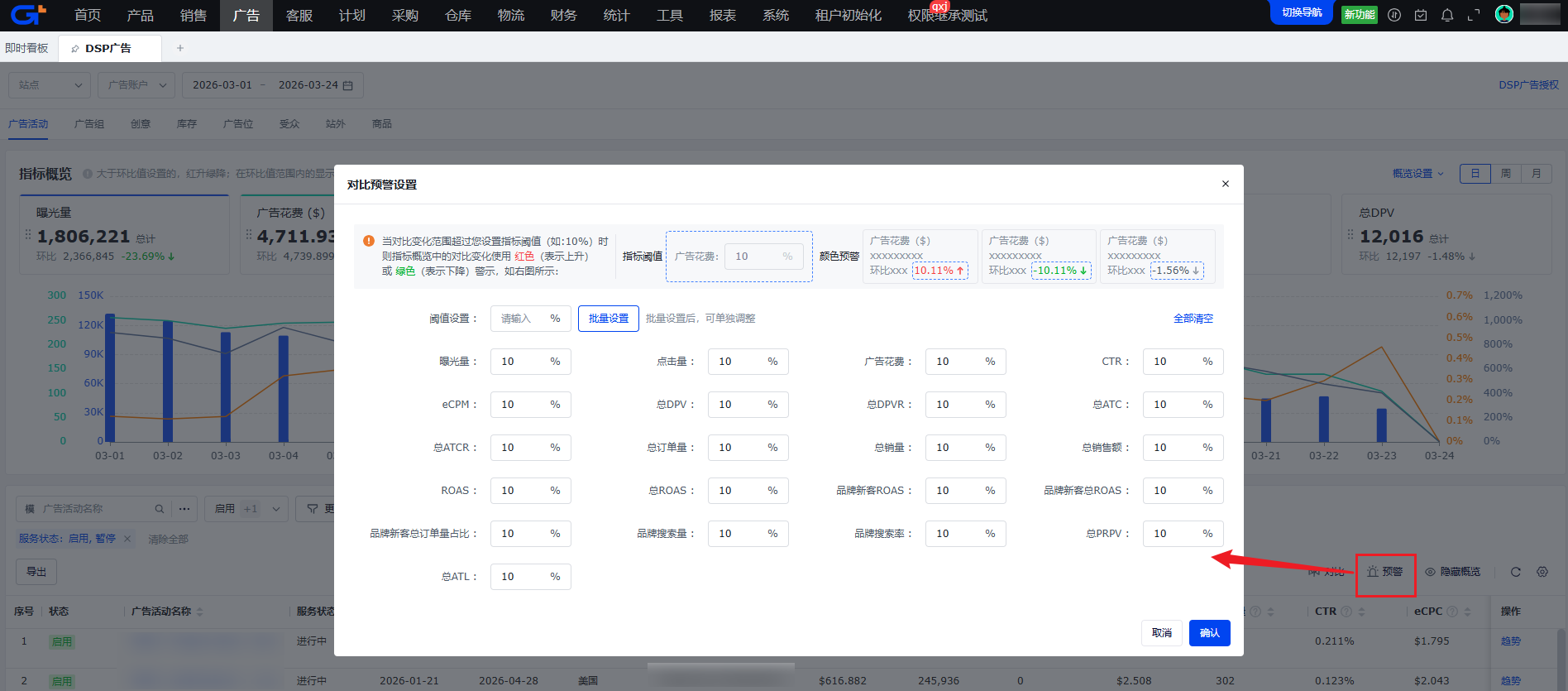 - 影响范围:按系统登录用户账号进行保存,由于DSP广告业绩指标较多,目前仅支持部分指标进行预警设置