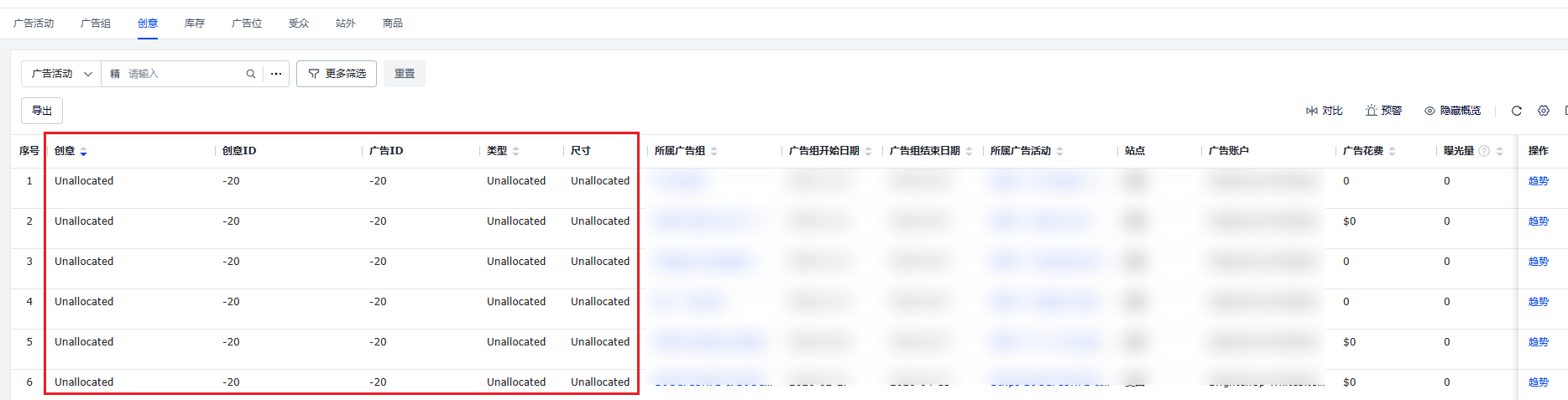 A:Unallocated的数据行来自平台API报表中的数据,代表的是“未分配”的含义,即广告活动广告组下存在有部分业绩指标,无法定位到具体的创意,就会统一归集到Unallocated的数据行;并非所有广告活动广告组都会存在这样的数据行,实际情况以API报表数据为准;