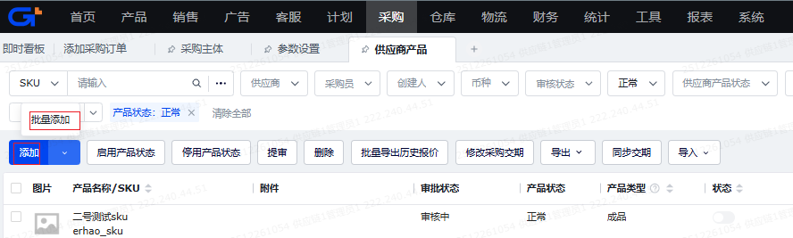 (1)点击【添加】或 【批量添加】按钮,设置供应商产品资料,点击【确定】创建供应商产品。