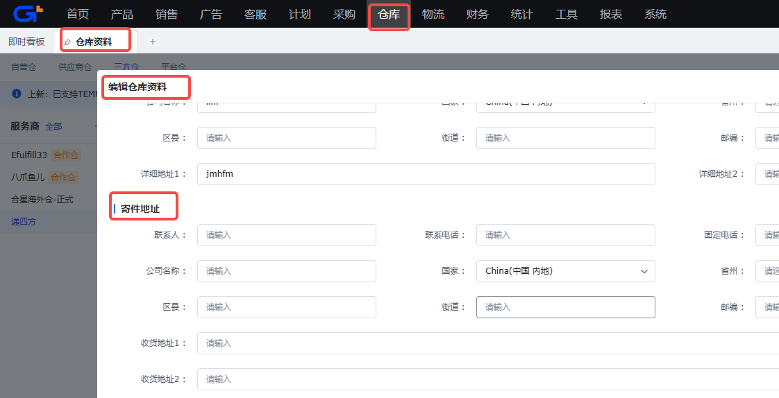 3.1.2.5 仓库资料维护及三方仓SKU配对