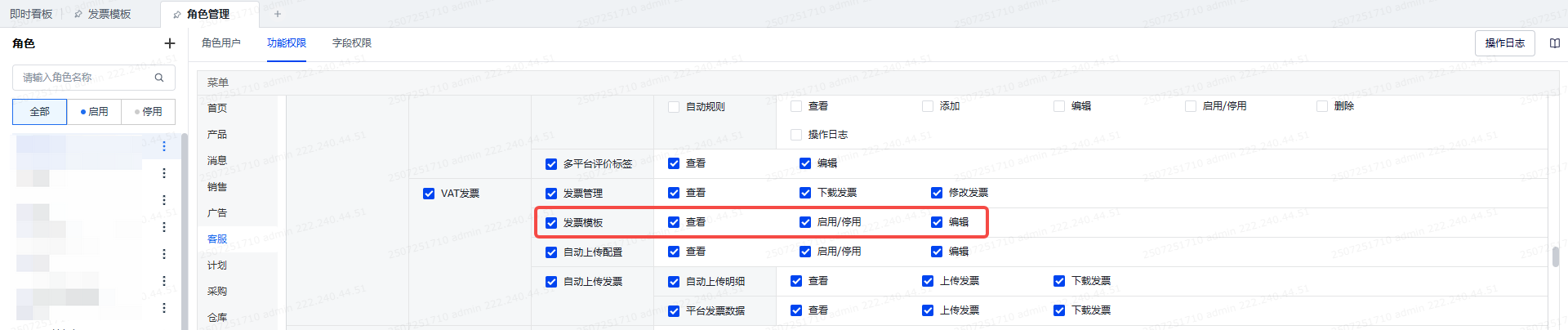 发票管理页面需要在【系统-角色管理-功能权限】下设置【客服-通用-VAT发票-发票模版】的相关权限。包含:查看、启用/停用、编辑