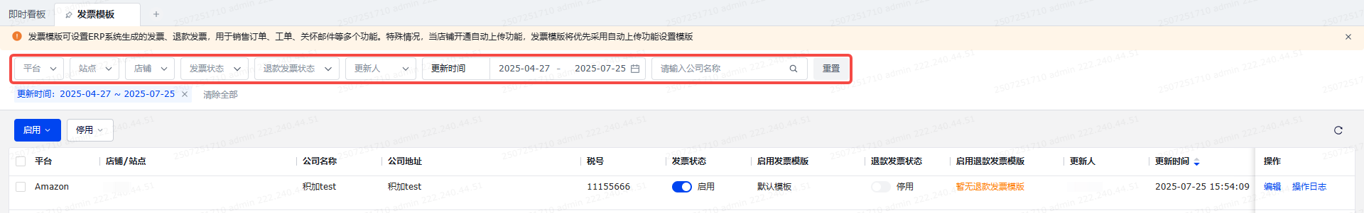 编辑功能是对单个店铺的发票模版进行编辑,每个店铺仅能生效一个发票模版和退款发票模版。不同平台因平台对发票的要求不同模版会存在差异