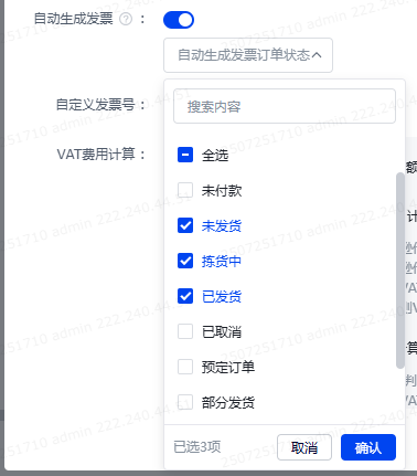 --自动生成发票:开启需要选择订单状态,当订单满足状态后系统自动生成发票,使用时直接下载或发送即可。关闭状态下,需要发票的订单由人工点击生成发票。(开启后所有满足条件的订单都会开具发票,对于无需全部订单开具发票的客户建议关闭该功能)