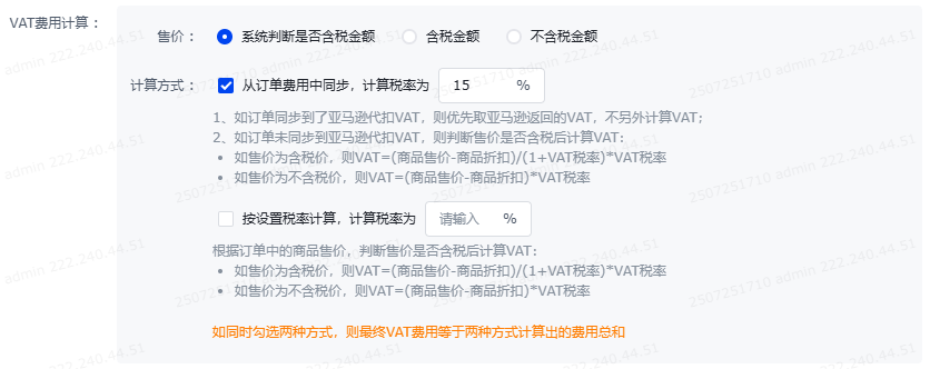Amazon特殊注:如果站点开启VAT参数,则系统会判断此站点的订单是否拿到亚马逊代扣的VAT费用;如有拿到代扣VAT,则优先取亚马逊返回的VAT,不另外计算VAT;如未拿到代扣VAT,则系统会根据设置的税率计算VAT费用,并体现在订单费用明细与销售利润分析中,参与销售毛利计算;