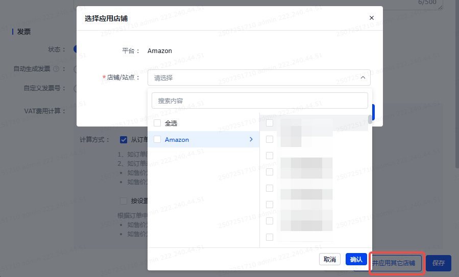 对于已经设置好的发票和退票信息的店铺,可以使用“保存并应用到其他店铺”功能,一键复制到其他店铺实现批量设置的效果。