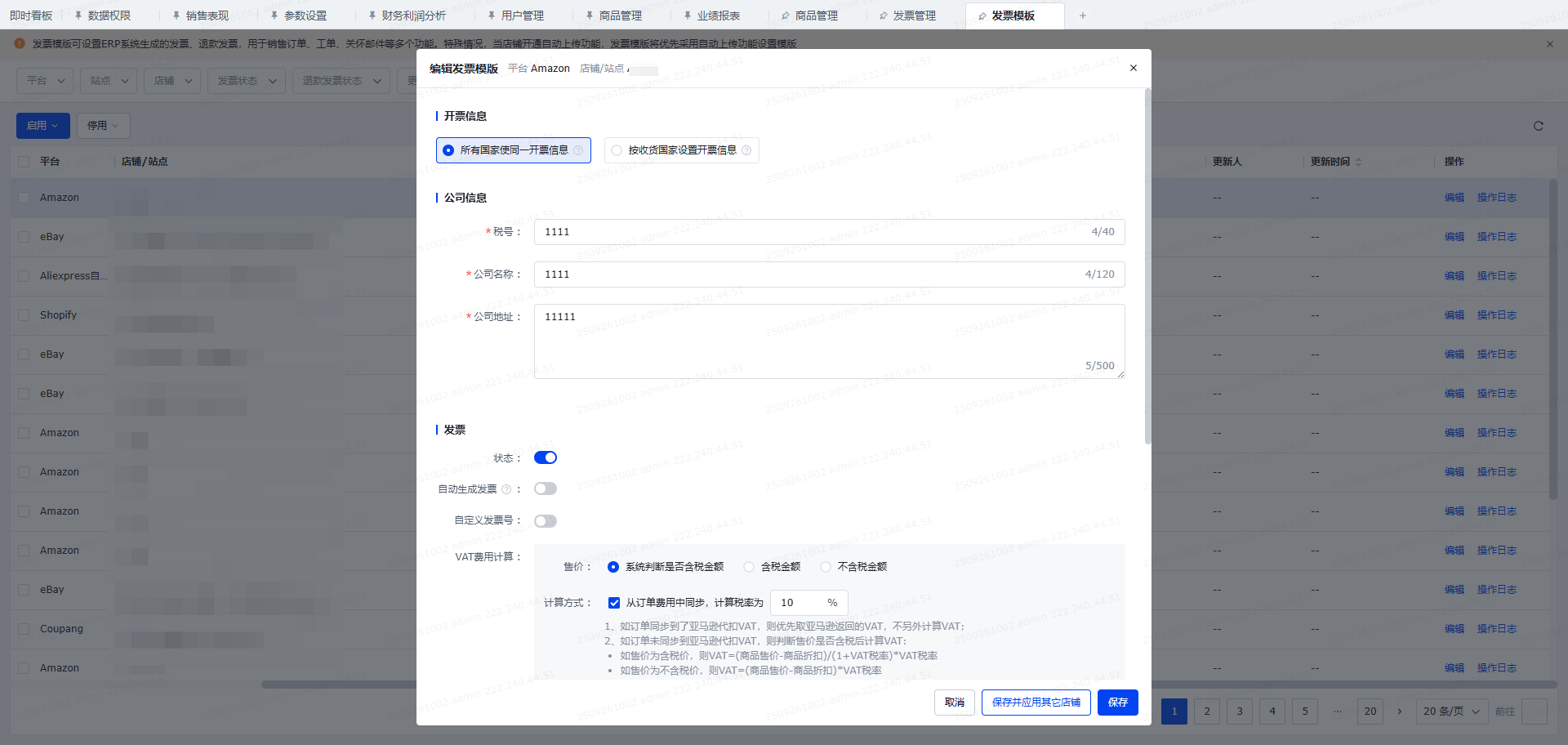 -- 所以国家使用同一开票信息:该店铺站点的所有订单开具的发票使用相同配置